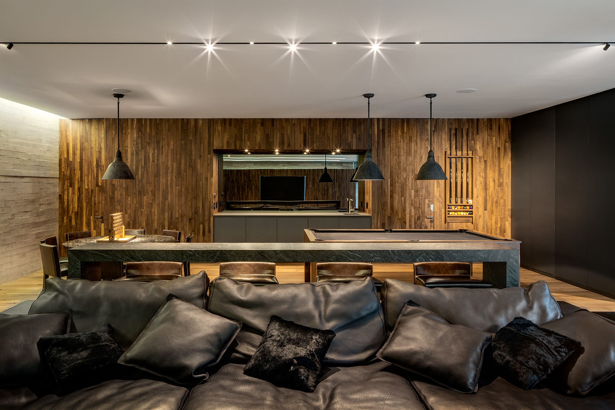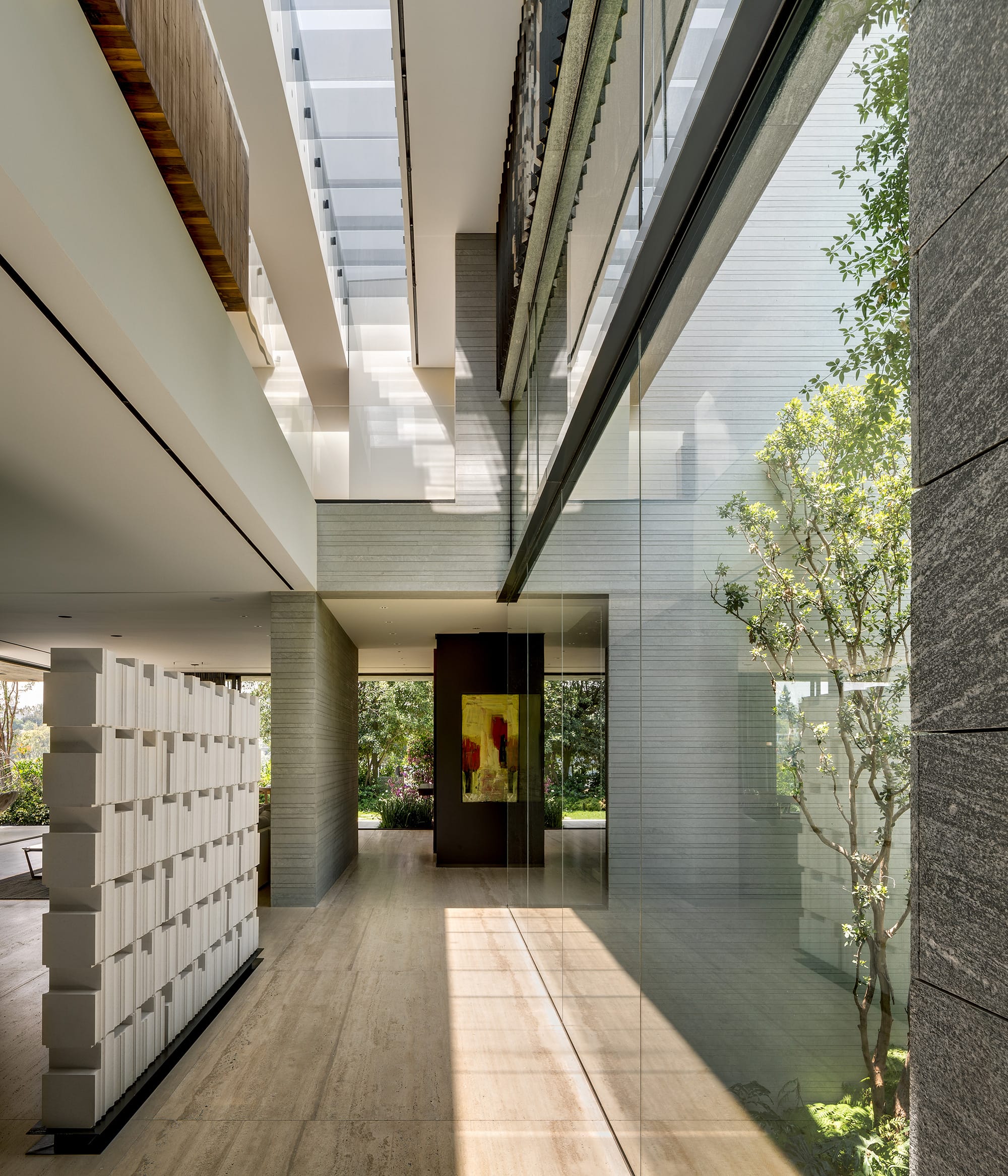 Casa O Cuatro organizes its public and private areas through volumes of pure geometry that contrast in both form and materiality. The upper volume, clad in dark stone, appears to float above a light and transparent ground floor that houses the social areas with a strong openness to the exterior. A double-height corridor connects the interior spaces, encouraging the entry of natural light. The indoor-outdoor relationship is reinforced through terraces, sliding doors, and stone materials that create a continuous transition. The garden acts as an articulating axis: on the ground floor, it connects with the social areas through large windows; in the basement, it unfolds to illuminate and link spaces such as the gym and play areas. Wood adds warmth and complements the material palette. Solar orientation guided the design: large windows and roof perforations allow light to enter throughout the day, while strategic overhangs regulate sun exposure, ensuring thermal comfort. Despite the consistent use of materials, each space was endowed with its own identity, achieving a balance between formal unity and spatial diversity.