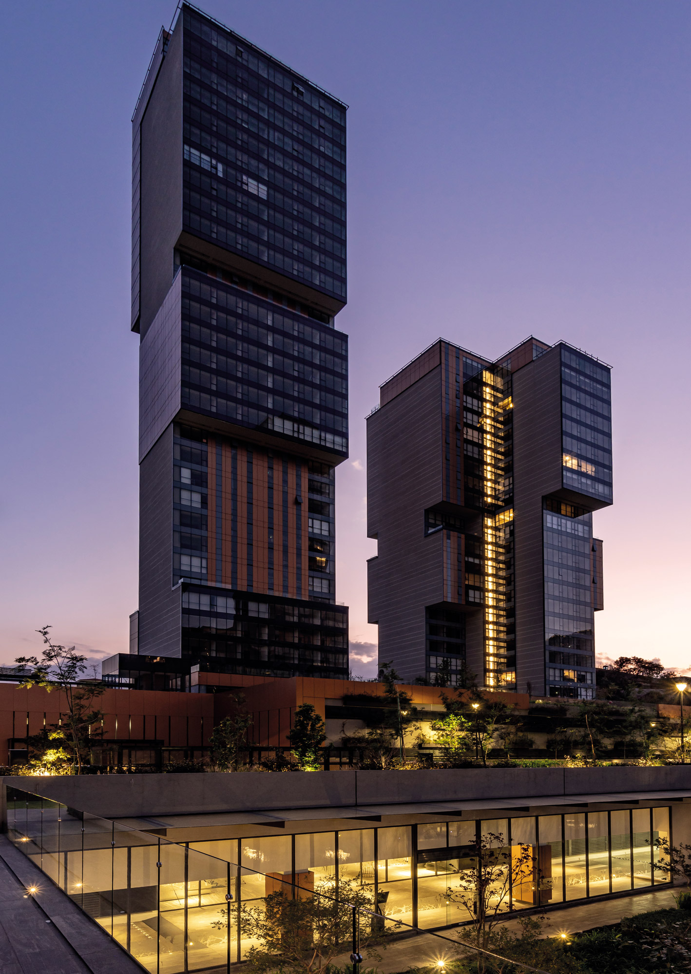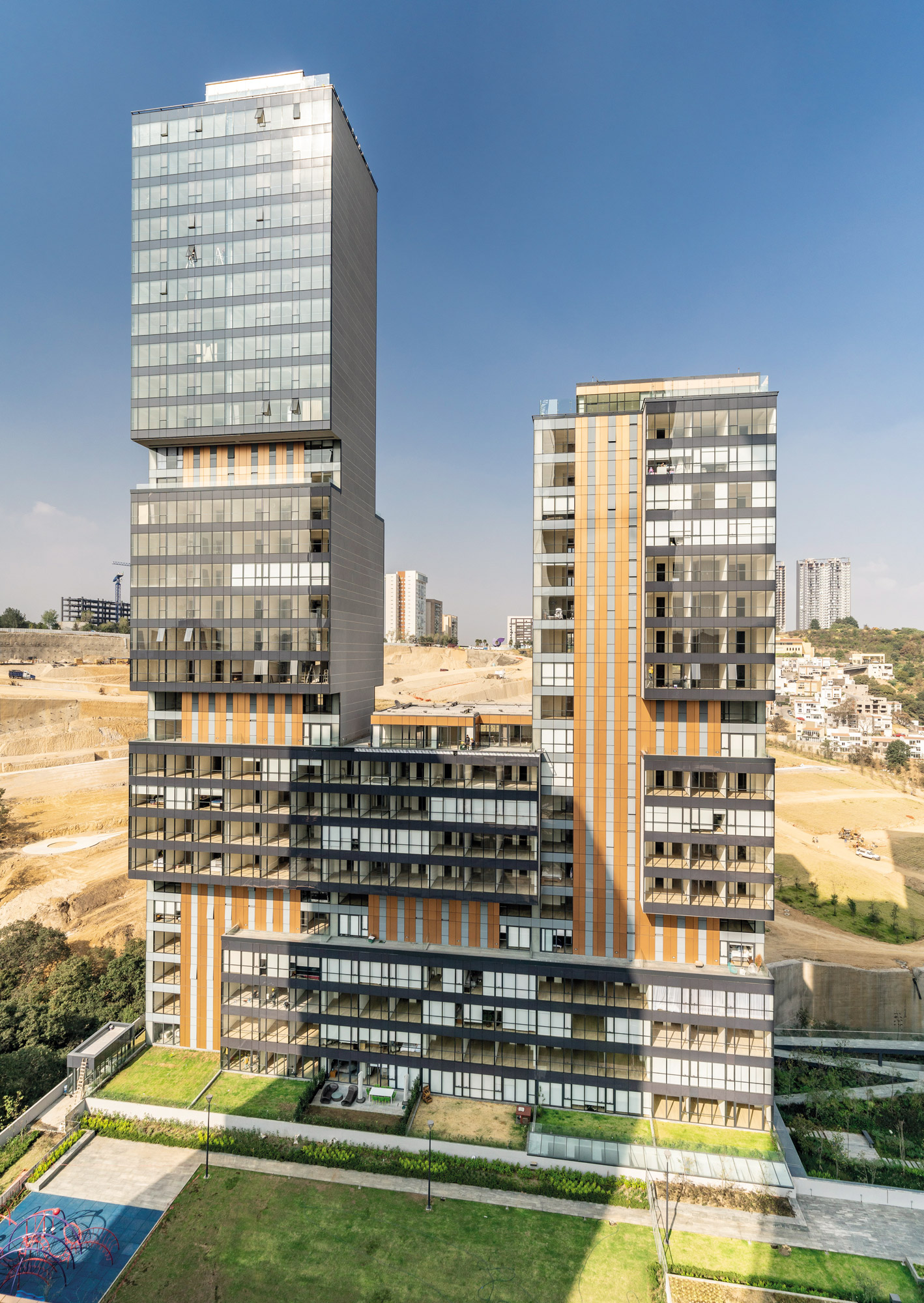 The towers stand out for their cantilevered volumes, which form terraces at different heights, while a central structural spine allows for the extrusion of apartments ranging from 90, 120, and 160 m². The façades are clad in transparent glass combined with copper and neutral-toned stripes, achieving a light, contemporary, and luminous appearance. The project includes 960 apartments divided into four phases of 240 units, each with independent access and its own amenities. Central Park thus establishes itself as an architectural and urban landmark in the area.