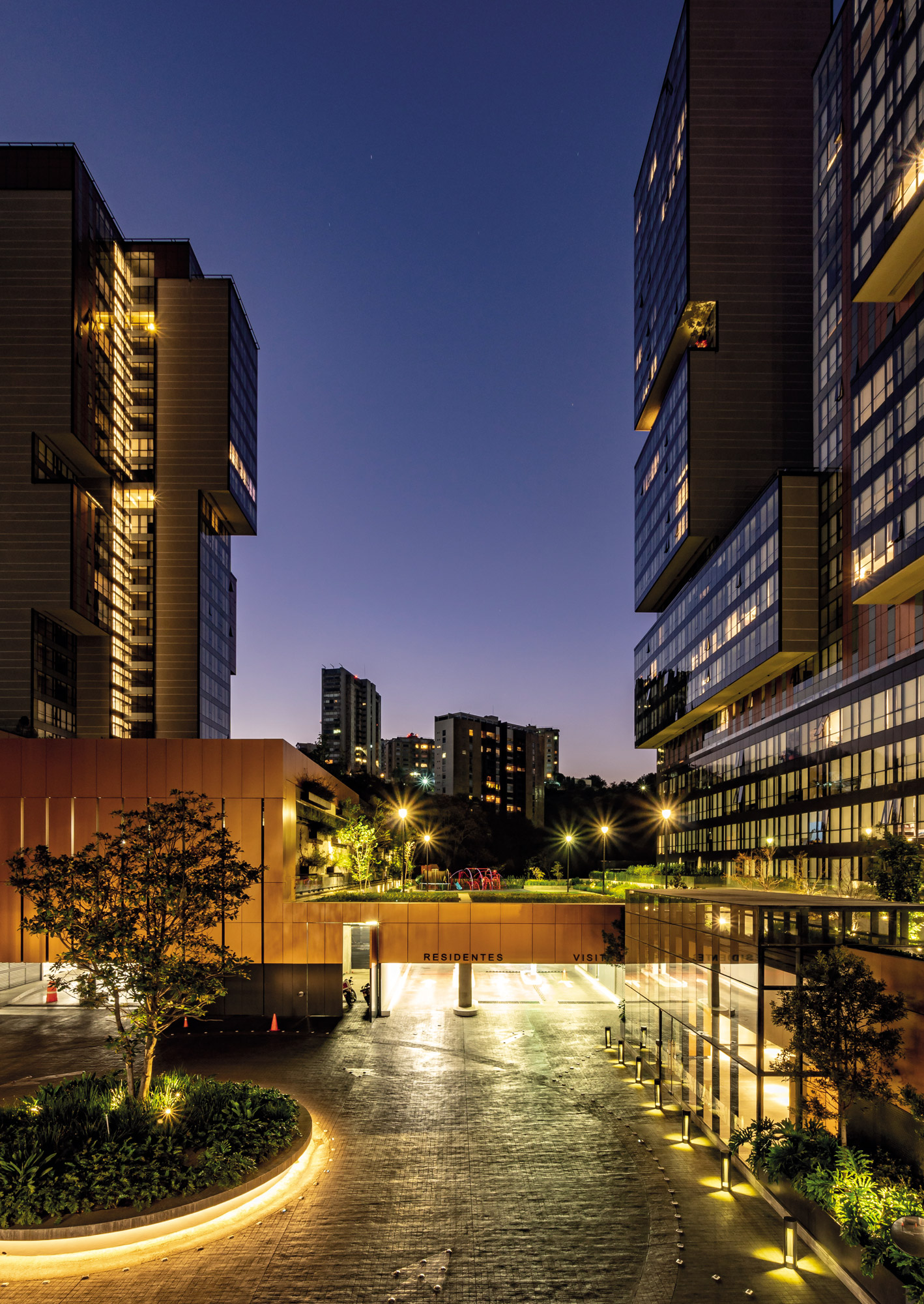 Central Park Bosque Real is a residential complex located in Huixquilucan, State of Mexico, offering a strategic location with privileged views and proximity to key areas such as Interlomas and Santa Fe. Its design revolves around a large central garden, surrounded by towers of 10, 20, and 30 levels, arranged in two parallel planes and set on a sloping terrain, creating an architectural profile inspired by the skyline of major cities.