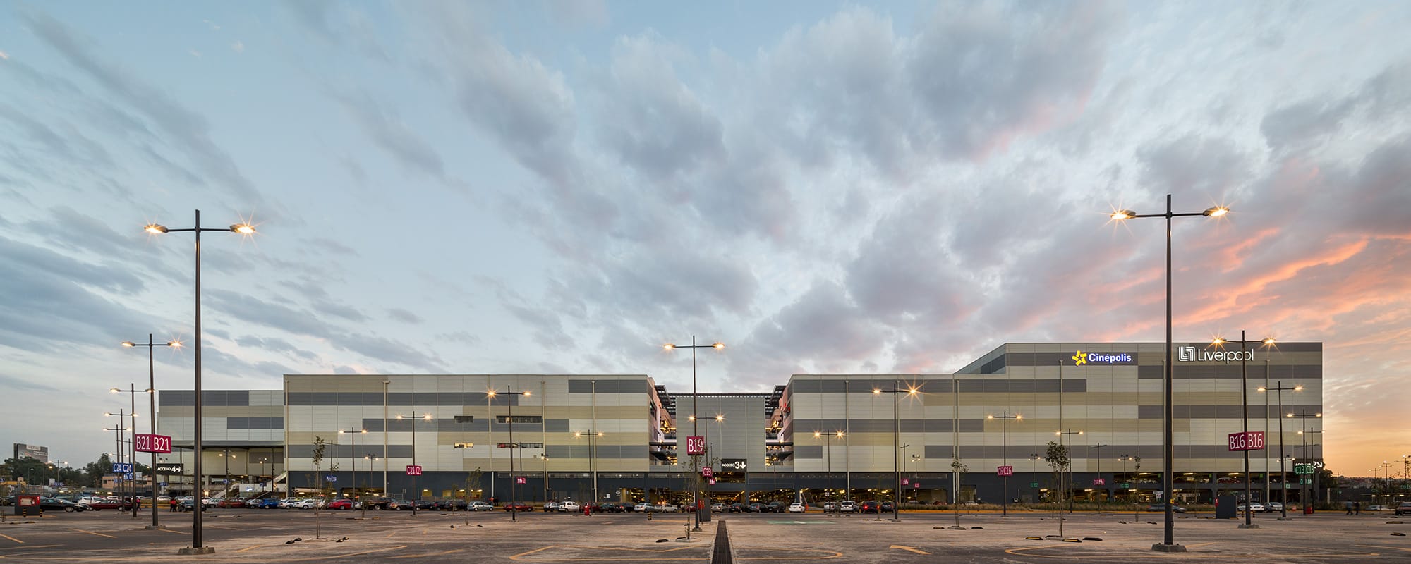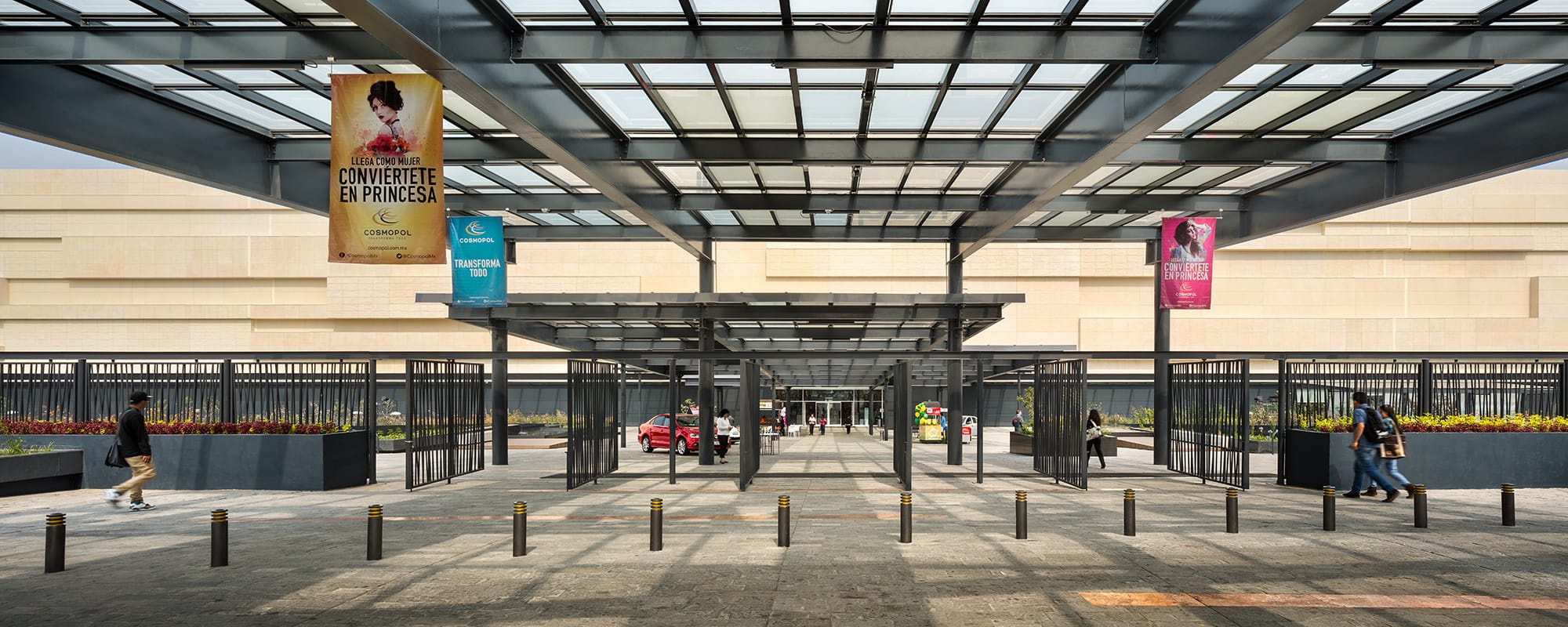 Cosmopol is a shopping mall located in the municipality of Coacalco, State of Mexico, to the north of Mexico City on José López Portillo avenue. This street connects the Mexico-Pachuca highway in Ecatepec and the Mexico-Querétaro highway in Tlalnepantla. The municipality is a strategic zone with a growing economy that is key to being considered an important center of local commerce. The site where the mall is located is rectangular in shape and includes an approximately 10-meter slope towards José López Portillo avenue. To emphasize the principal façade and stand out from the terrain, two parking levels were included that function as a podium by connecting the pedestrian entrance level connected to the two large semi-covered areas that link the plaza with the main avenue.
