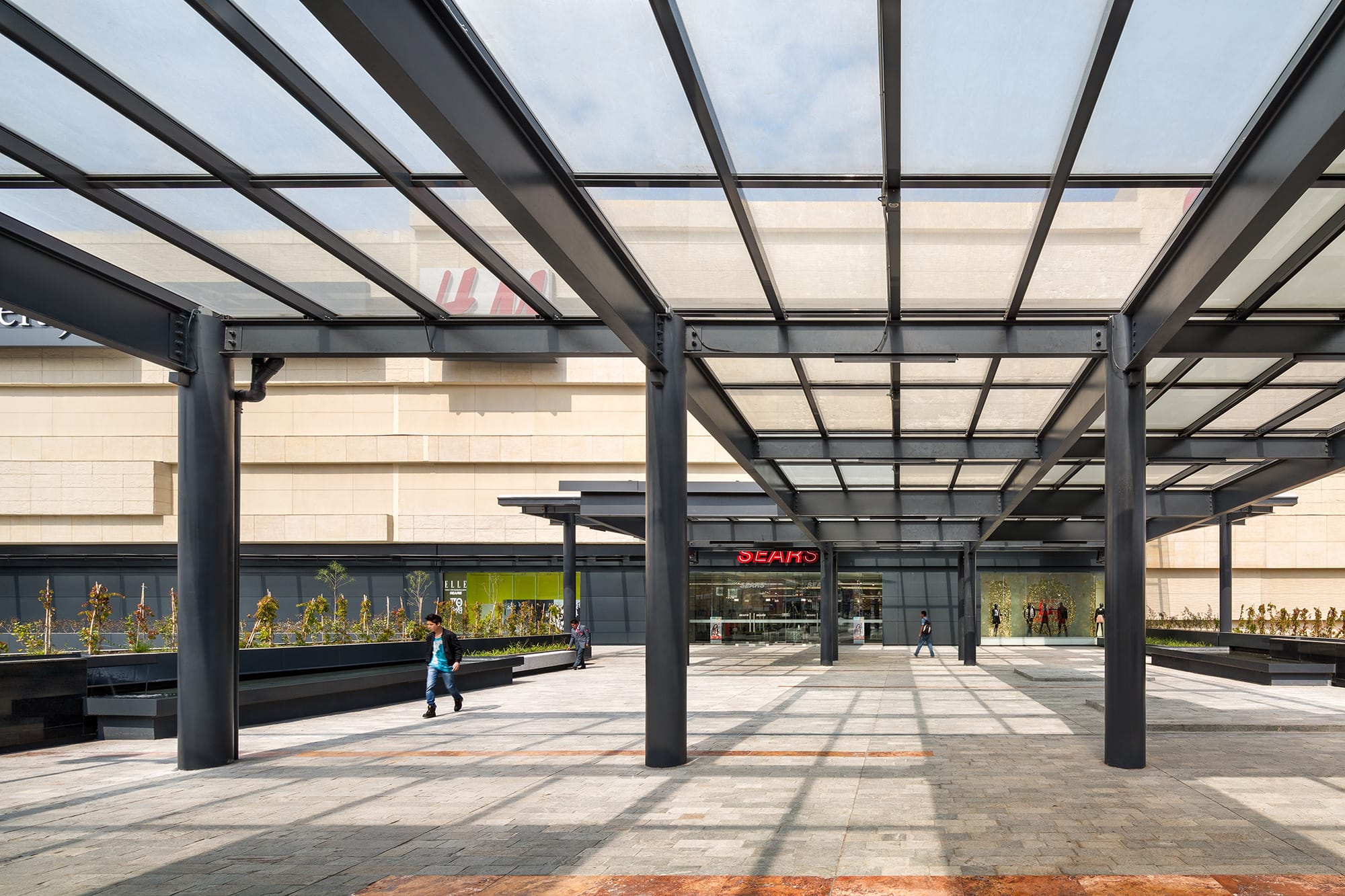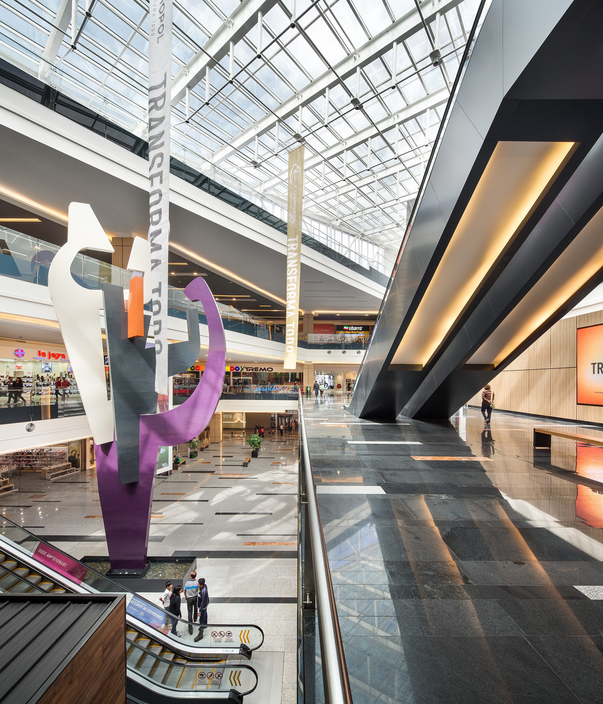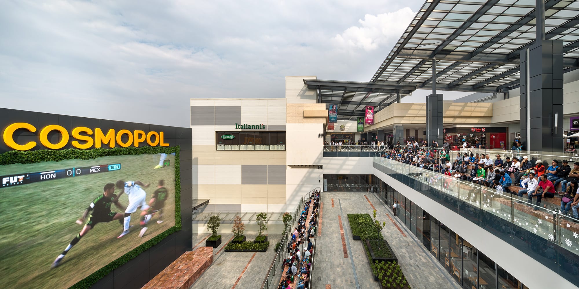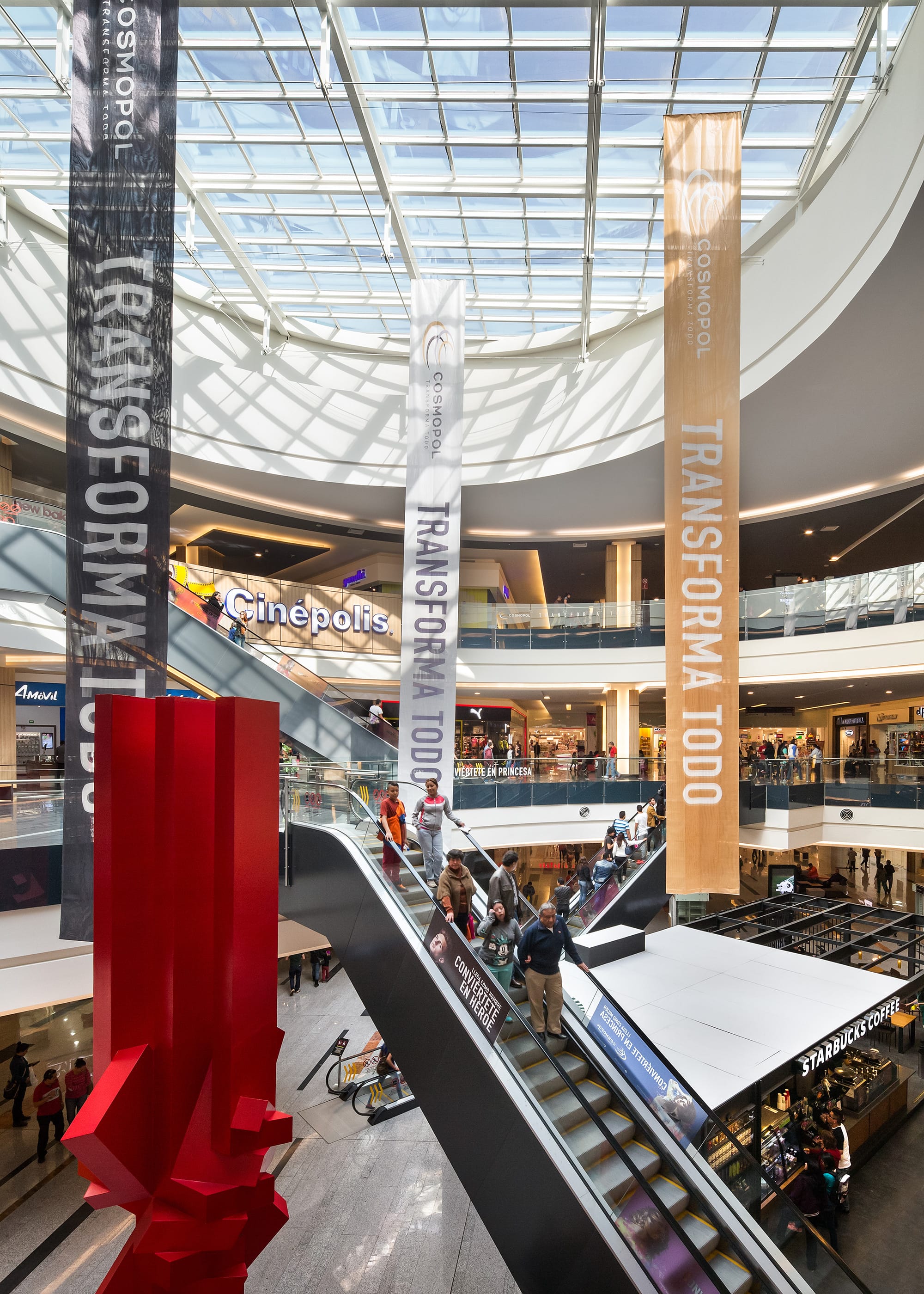 Based on a “fashion mall” concept, Cosmopol includes three floors of shopping that incorporate different spaces including cinemas, department stores, retail stores, food courts and restaurants, among others.