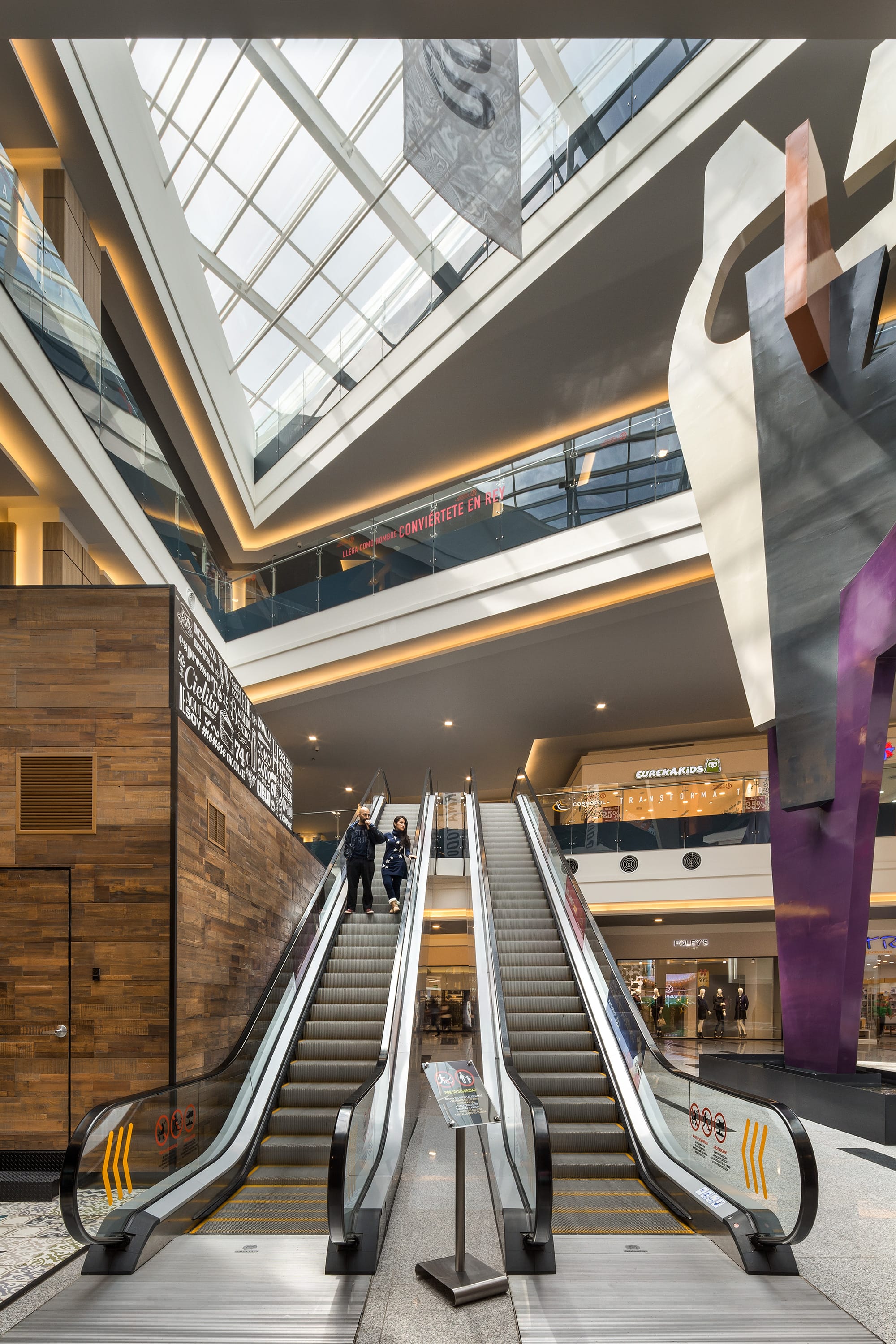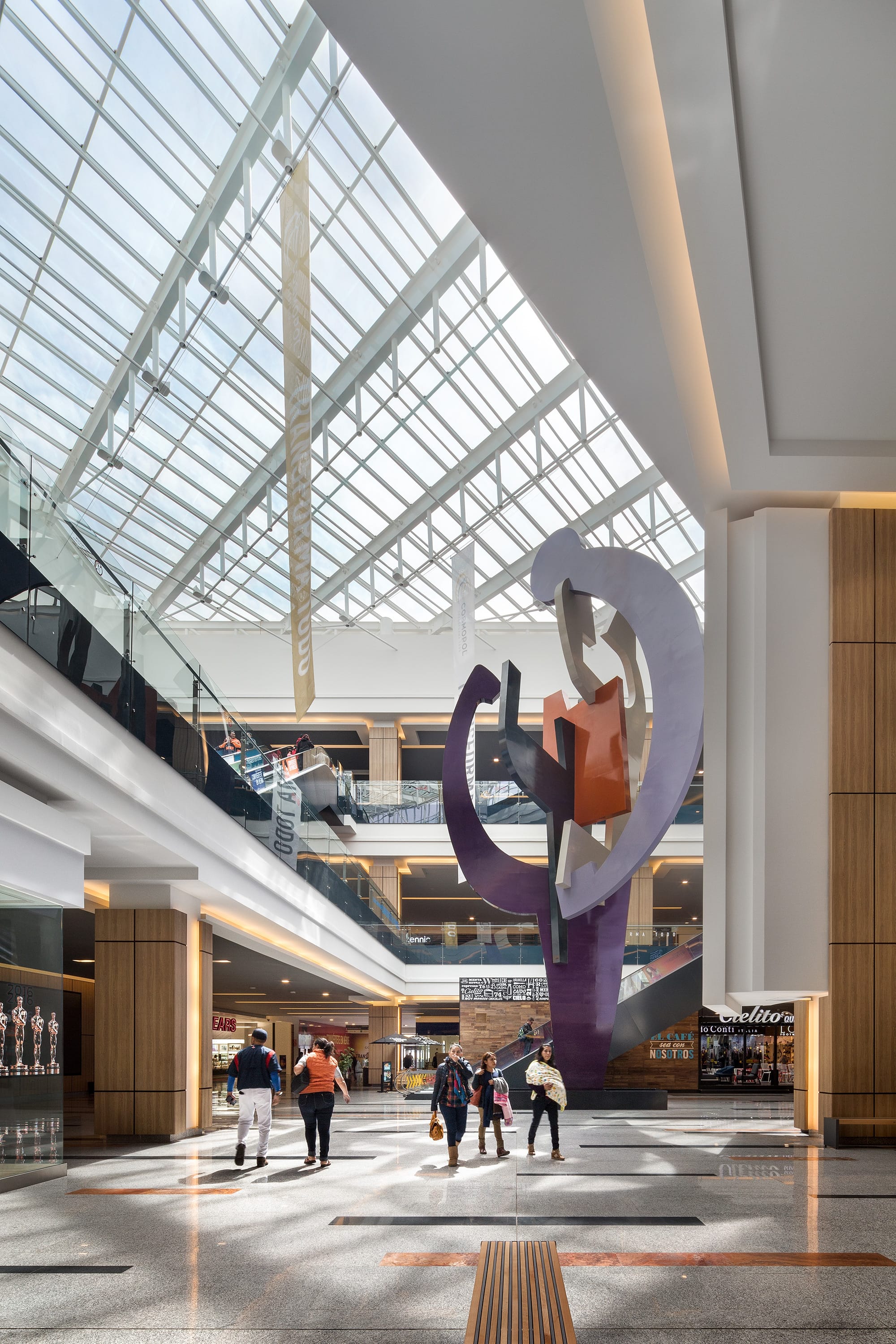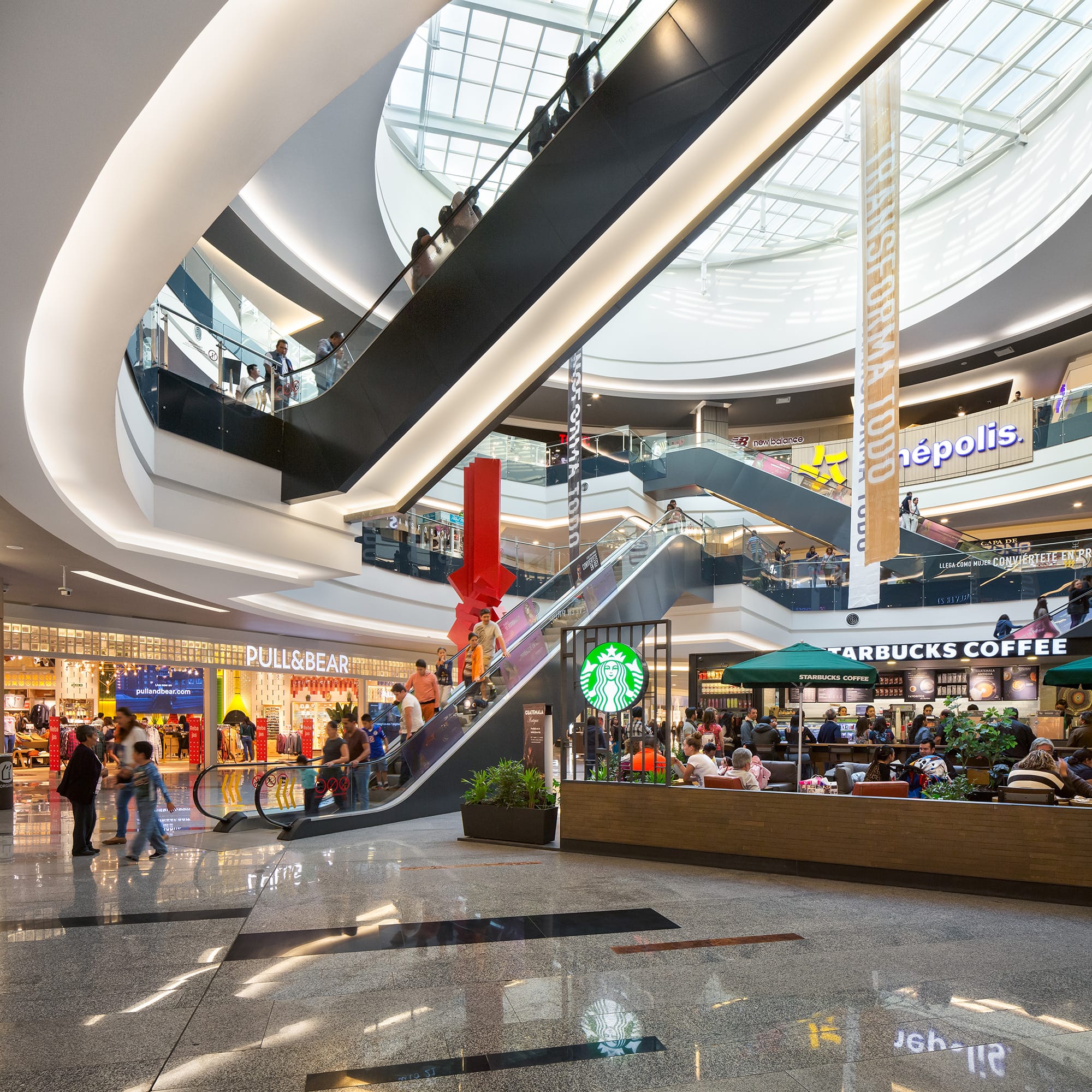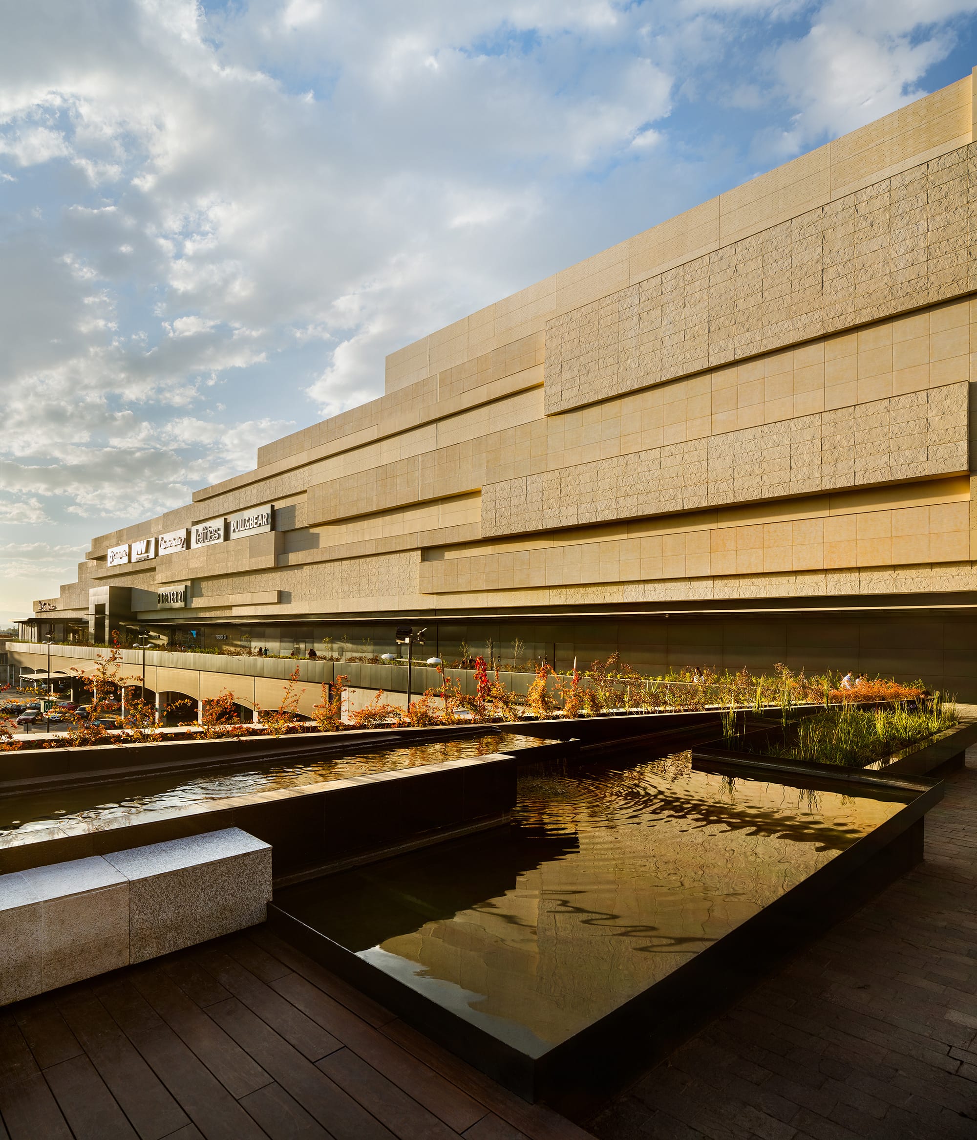 From outside, the shopping mall is presented as a large rectangular container, with an emphasis on the principal façade, which with its 400-meter length and horizontal strips with different textures and a uniform color, reinforces the horizontal nature of the mall. The concept is based on two well-defined areas with pure shapes (a circle, a triangle), between which horizontal displacements give movement to the space while letting natural light into the atriums, which contain artworks by Sebastian and Tere Metta. The central space generates external terraces at ground floor level, generating a forum with a vast LED screen as a backdrop. The shopping mall, which covers a built area of 210,000 m2, includes major anchor stores that consolidate the general layout of the project.