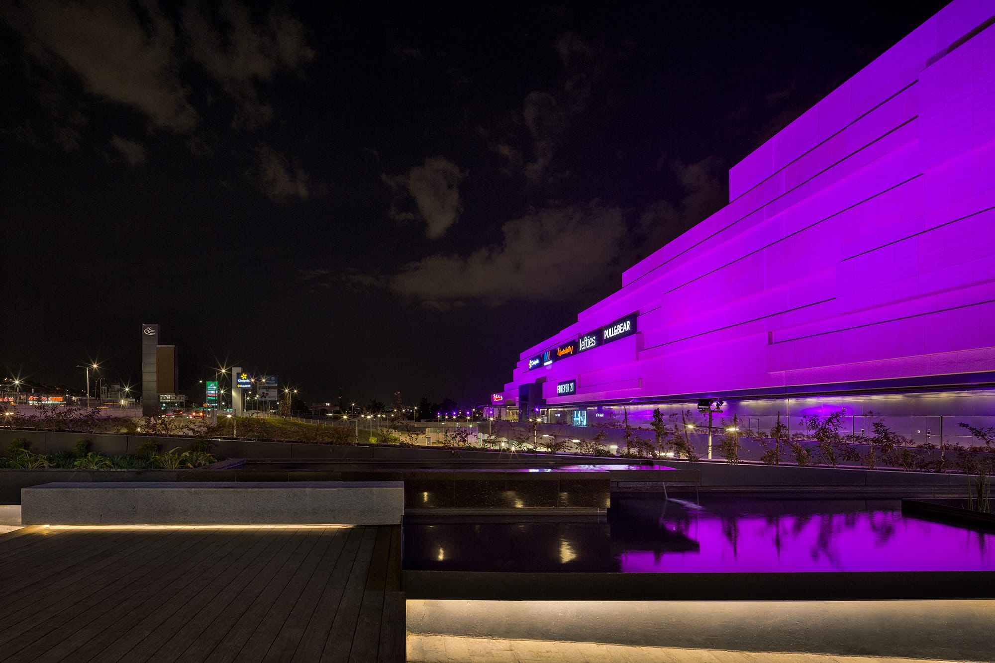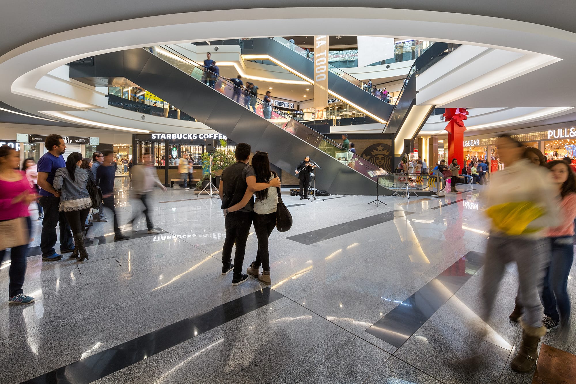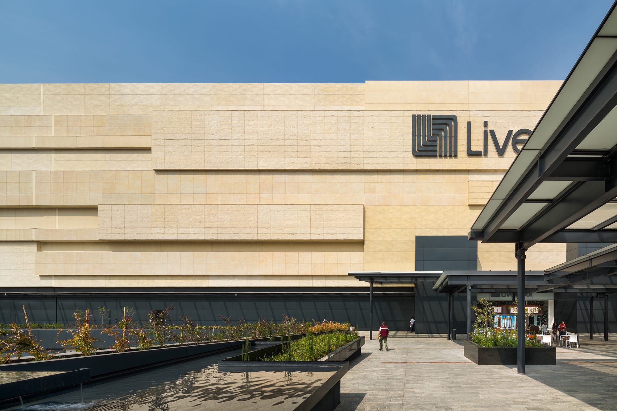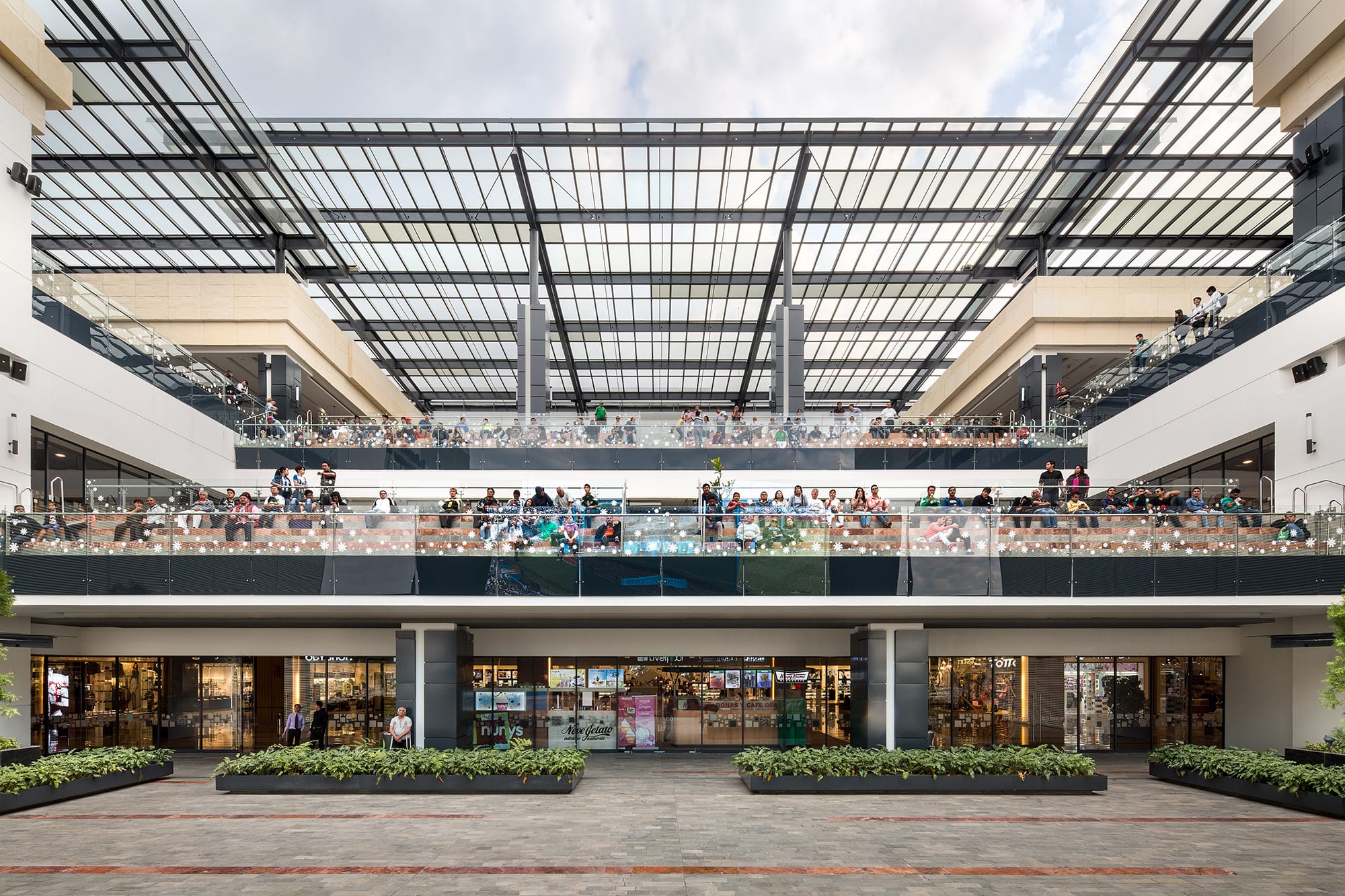 From outside, the shopping mall is presented as a large rectangular container, with an emphasis on the principal façade, which with its 400-meter length and horizontal strips with different textures and a uniform color, reinforces the horizontal nature of the mall. The concept is based on two well-defined areas with pure shapes (a circle, a triangle), between which horizontal displacements give movement to the space while letting natural light into the atriums, which contain artworks by Sebastian and Tere Metta. The central space generates external terraces at ground floor level, generating a forum with a vast LED screen as a backdrop. The shopping mall, which covers a built area of 210,000 m2, includes major anchor stores that consolidate the general layout of the project.