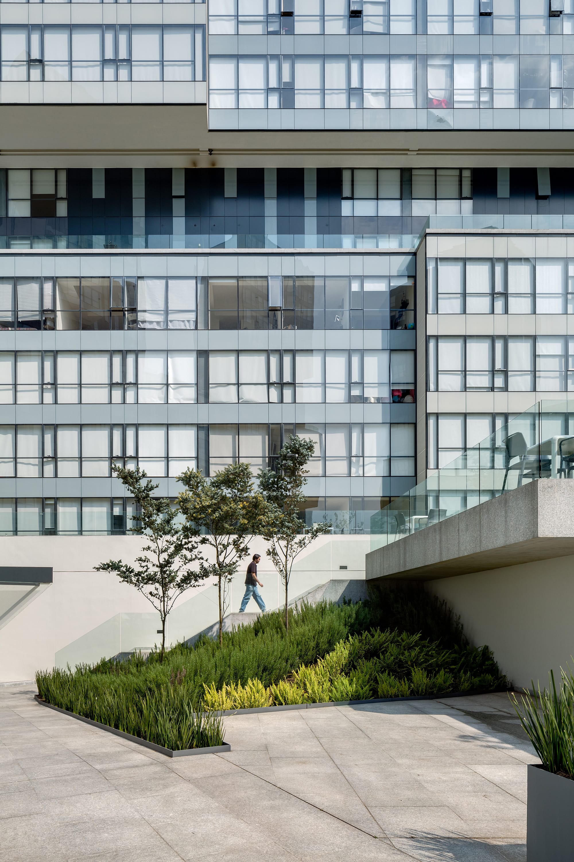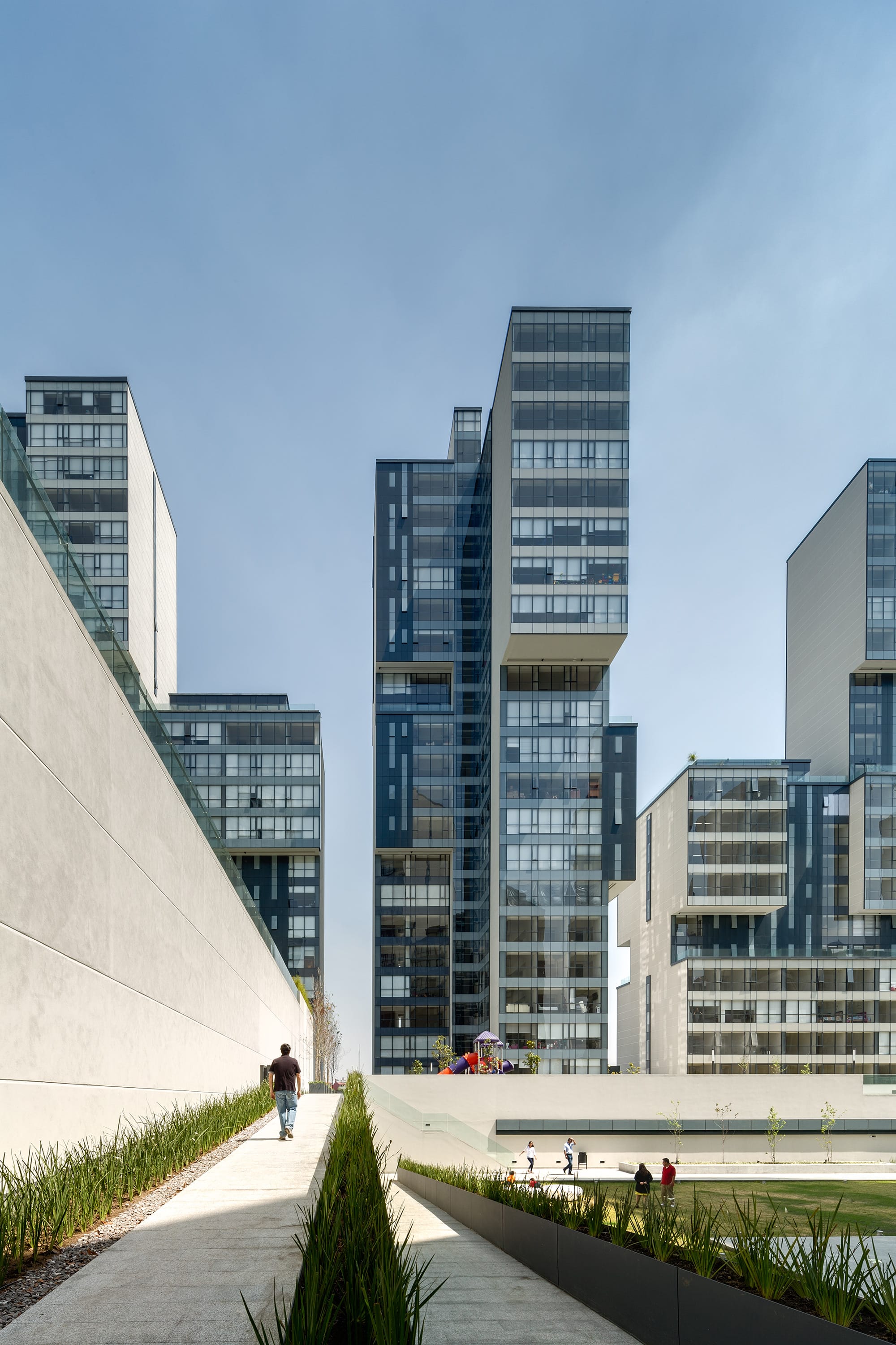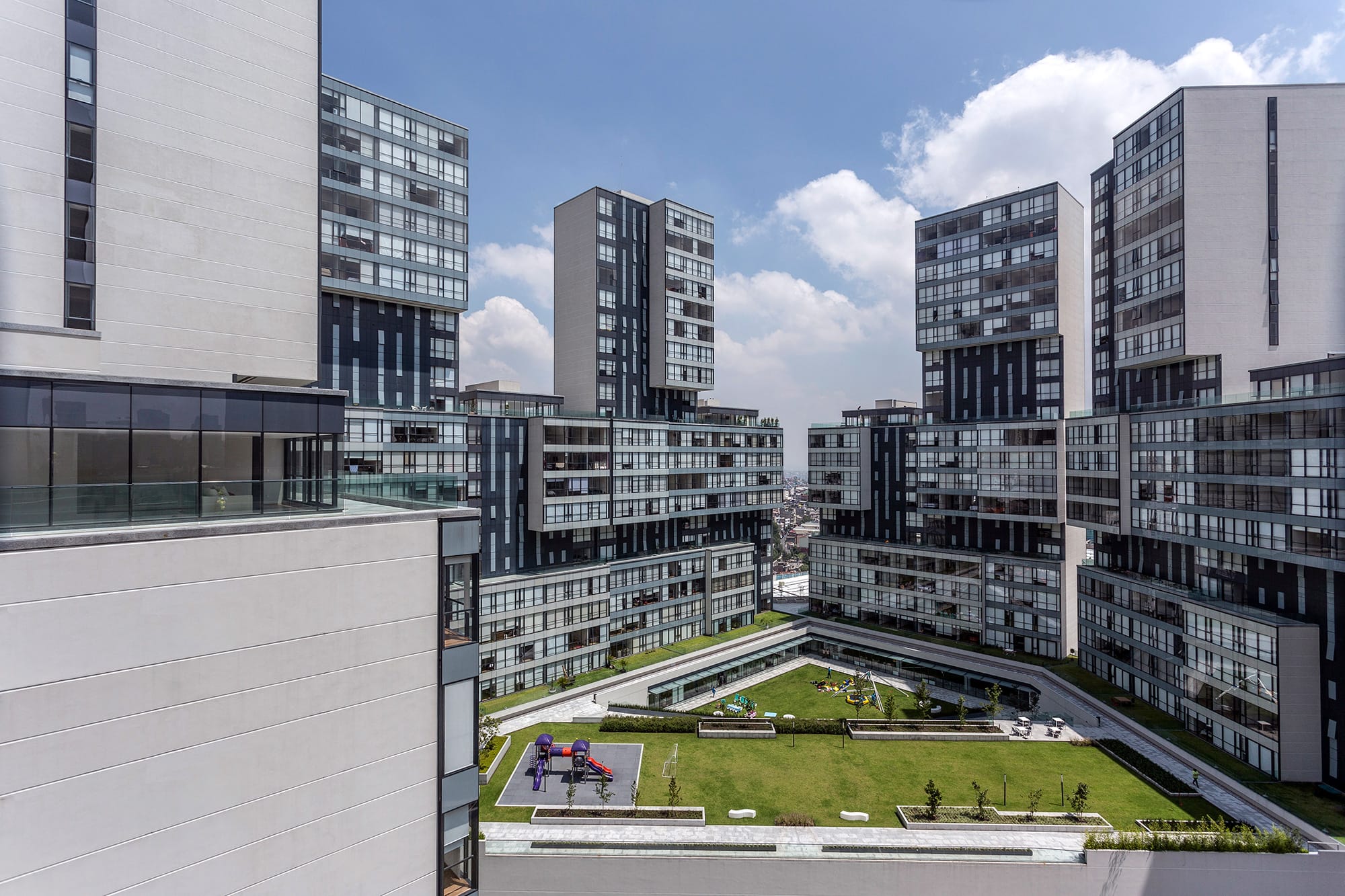 Central Park Interlomas es un conjunto residencial ubicado en una de las zonas más elevadas de Interlomas, al poniente de la Ciudad de México. Emplazado sobre una meseta natural, evita colindancias directas y ofrece vistas inalterables desde todos los departamentos. El proyecto gira en torno a un área verde central de 12,000 m², rodeada por 12 torres de 10 y 20 niveles que evocan un skyline urbano, integrándose con el entorno natural. Las torres, compuestas por volúmenes extruidos y voladizos, generan terrazas a distintas alturas. Cada edificio cuenta con una espina estructural que permite configuraciones de 90, 120 y 160 m², dando movimiento a sus fachadas. Las envolventes combinan cristal transparente, franjas horizontales y verticales en tonos neutros, aluminio y concreto expuesto, logrando una imagen sobria, ligera y contemporánea. Con 720 departamentos en total, el conjunto se desarrolla en tres etapas de 240 unidades, conectadas por una vialidad perimetral. Cada etapa ofrece completas amenidades: gimnasio, alberca, spa, salón de eventos, sala de proyecciones, ludoteca y estacionamiento. Por su escala, ubicación y propuesta arquitectónica, Central Park Interlomas se consolida como un referente urbano en la zona.