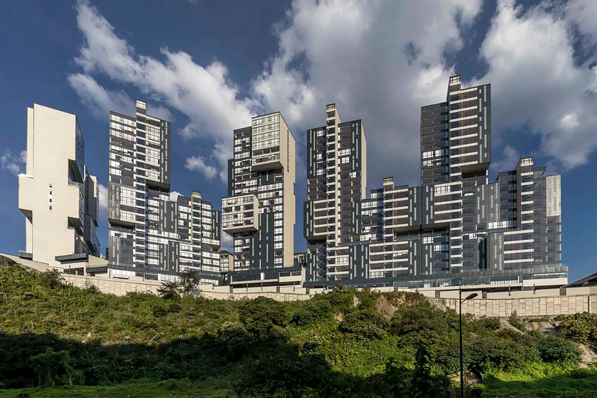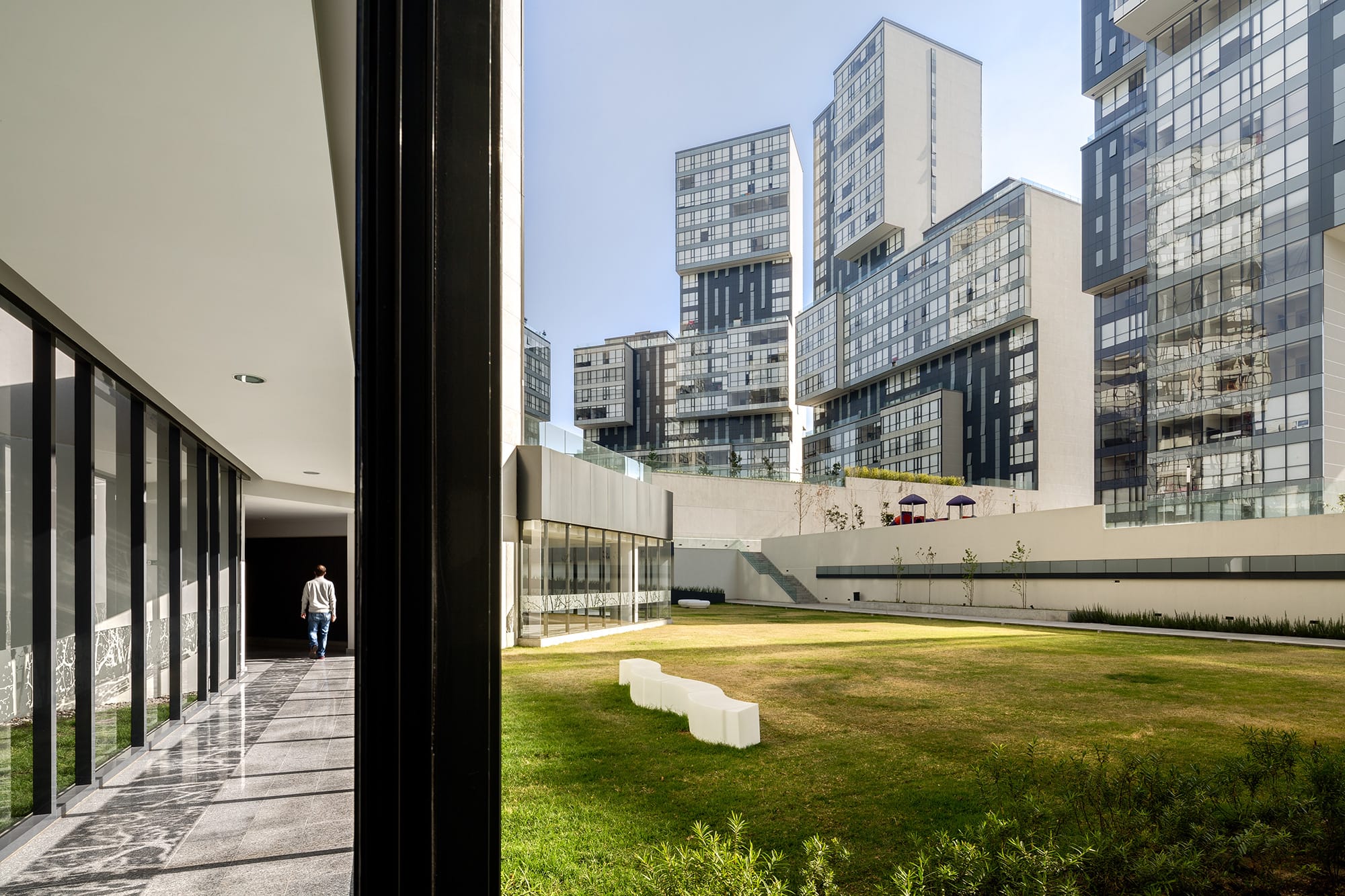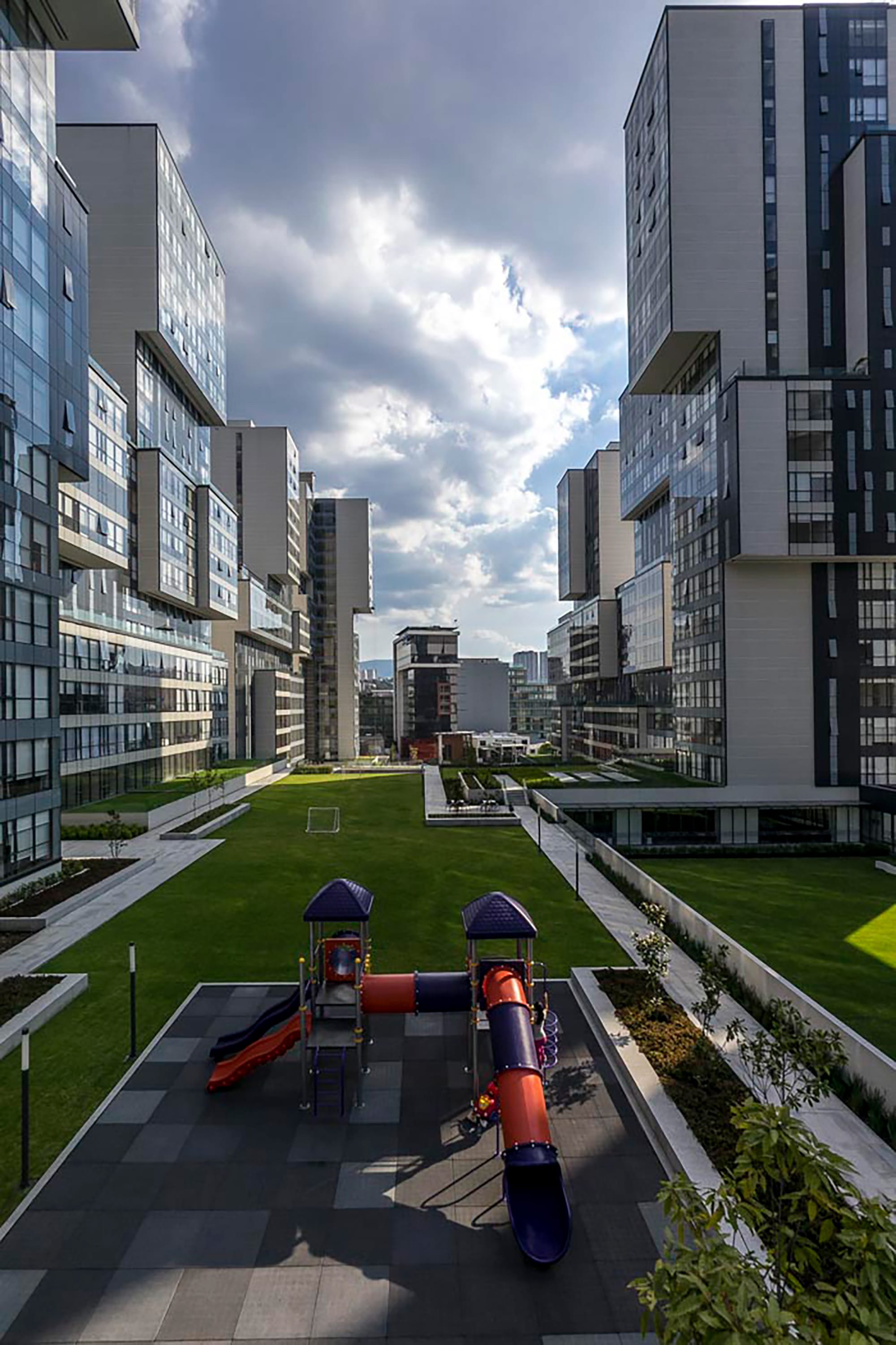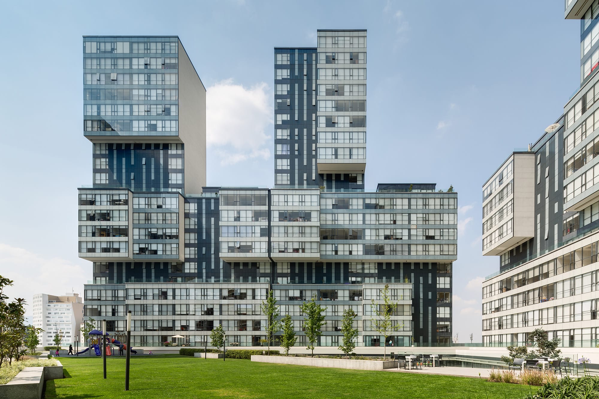 Central Park Interlomas es un conjunto residencial ubicado en una de las zonas más elevadas de Interlomas, al poniente de la Ciudad de México. Emplazado sobre una meseta natural, evita colindancias directas y ofrece vistas inalterables desde todos los departamentos. El proyecto gira en torno a un área verde central de 12,000 m², rodeada por 12 torres de 10 y 20 niveles que evocan un skyline urbano, integrándose con el entorno natural. Las torres, compuestas por volúmenes extruidos y voladizos, generan terrazas a distintas alturas. Cada edificio cuenta con una espina estructural que permite configuraciones de 90, 120 y 160 m², dando movimiento a sus fachadas. Las envolventes combinan cristal transparente, franjas horizontales y verticales en tonos neutros, aluminio y concreto expuesto, logrando una imagen sobria, ligera y contemporánea. Con 720 departamentos en total, el conjunto se desarrolla en tres etapas de 240 unidades, conectadas por una vialidad perimetral. Cada etapa ofrece completas amenidades: gimnasio, alberca, spa, salón de eventos, sala de proyecciones, ludoteca y estacionamiento. Por su escala, ubicación y propuesta arquitectónica, Central Park Interlomas se consolida como un referente urbano en la zona.
