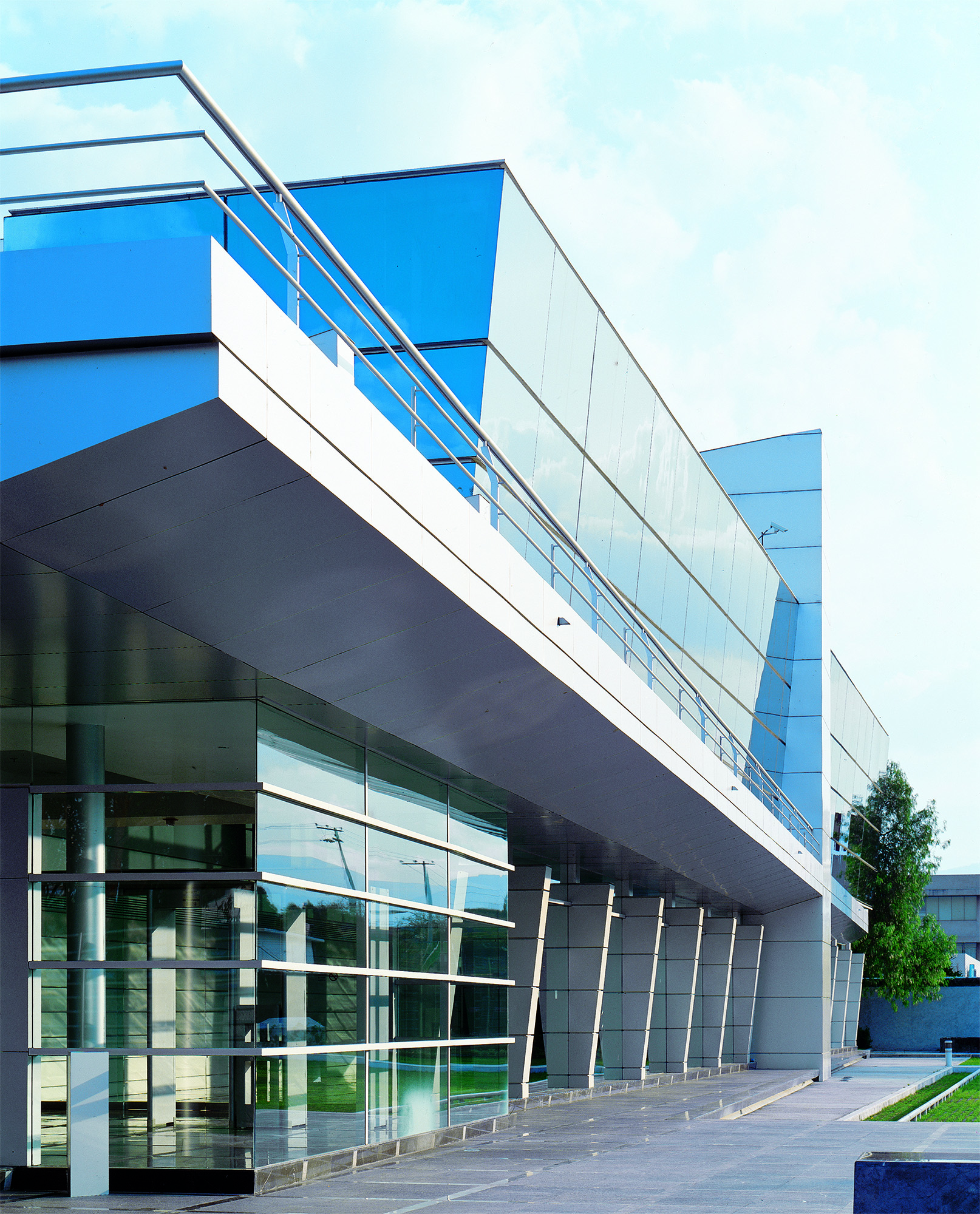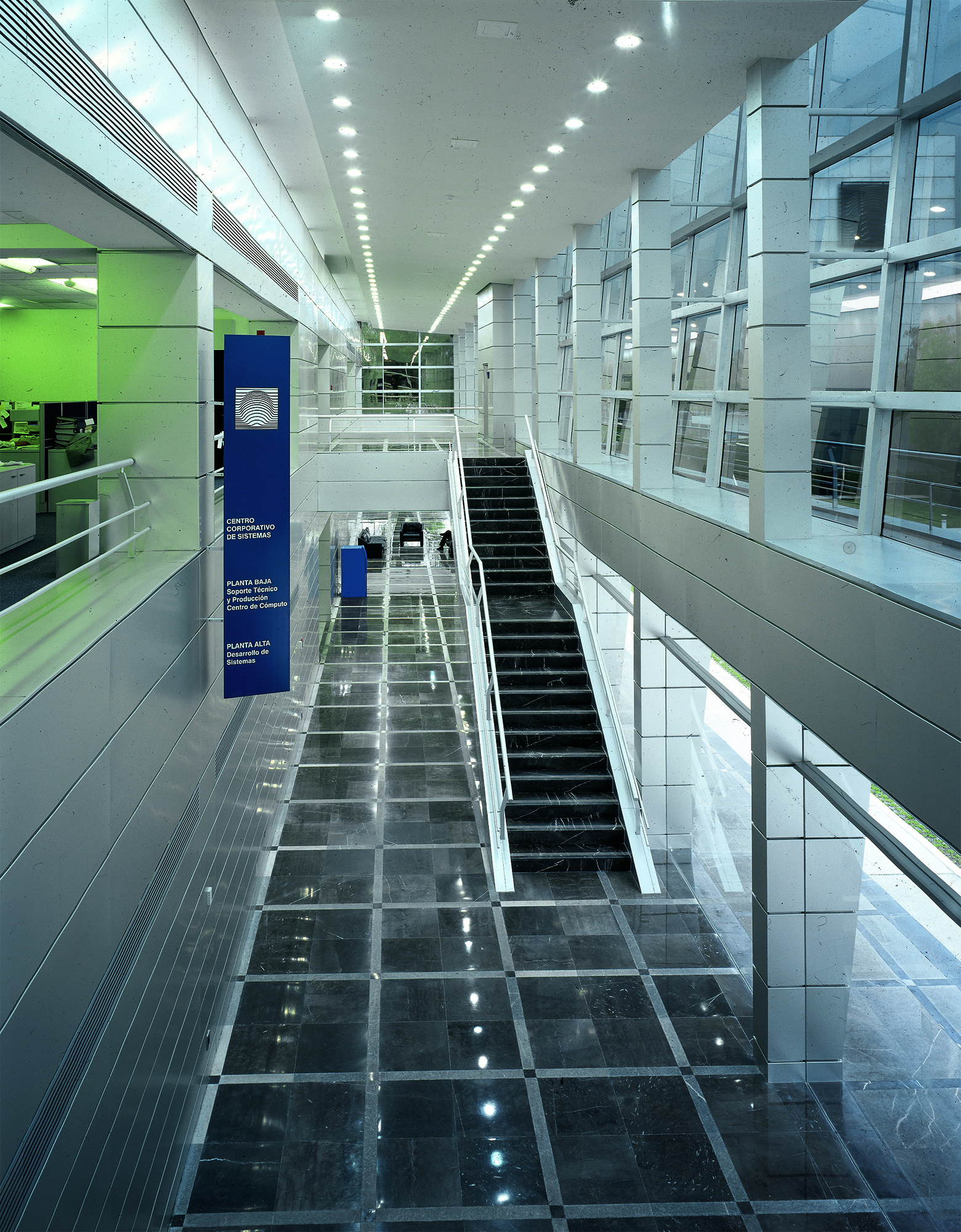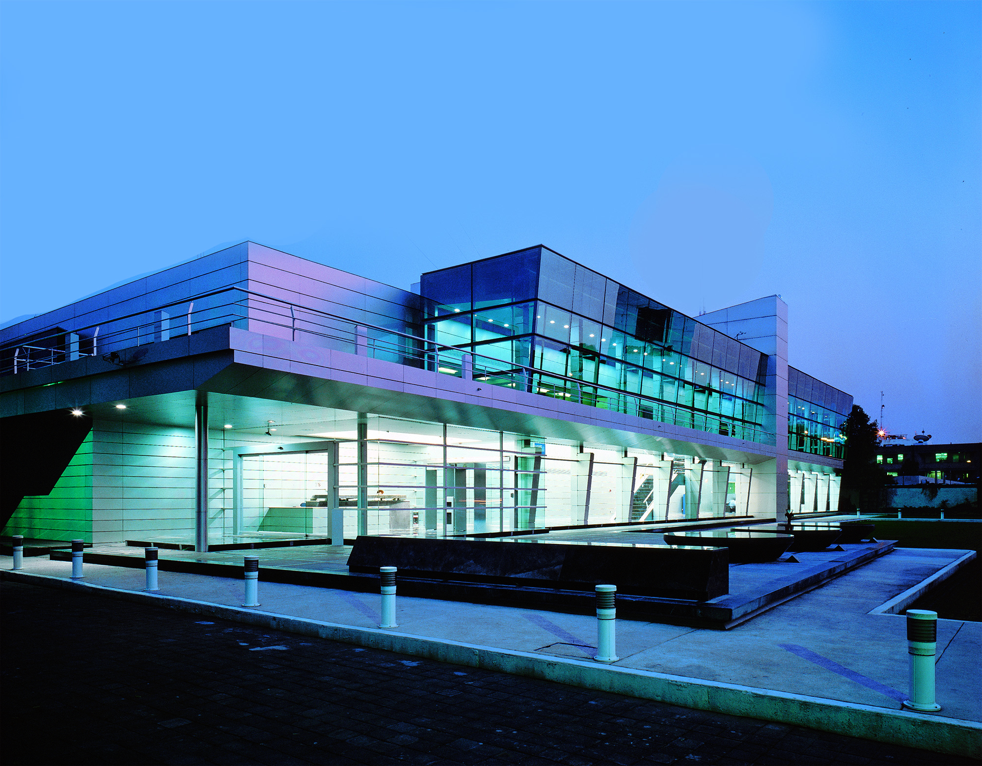 El Centro de Cómputo Tlalpan plantea una nueva tipología al romper con el modelo tipo búnker y permitir el recorrido seguro por áreas críticas mediante un pasillo perimetral acristalado, con vocación didáctica y alto contenido tecnológico. El proyecto reutiliza la estructura original de concreto, reforzada y ampliada, como base para una nueva organización espacial a la que se integran volúmenes de cristal y panelería de aluminio. Conectado por un eje principal de 195 metros de longitud y 4 metros de ancho, los espacios se distribuyen en dos niveles en torno a dos vestíbulos, incorporando un patio interior que aporta luz y forma. Totalmente automatizado, el edificio integra sistemas de control avanzados y cumple con estándares internacionales. Su diseño flexible permite reconfigurar áreas y funciones sin comprometer la operación de servicios de banca sistematizada a nivel multinacional.