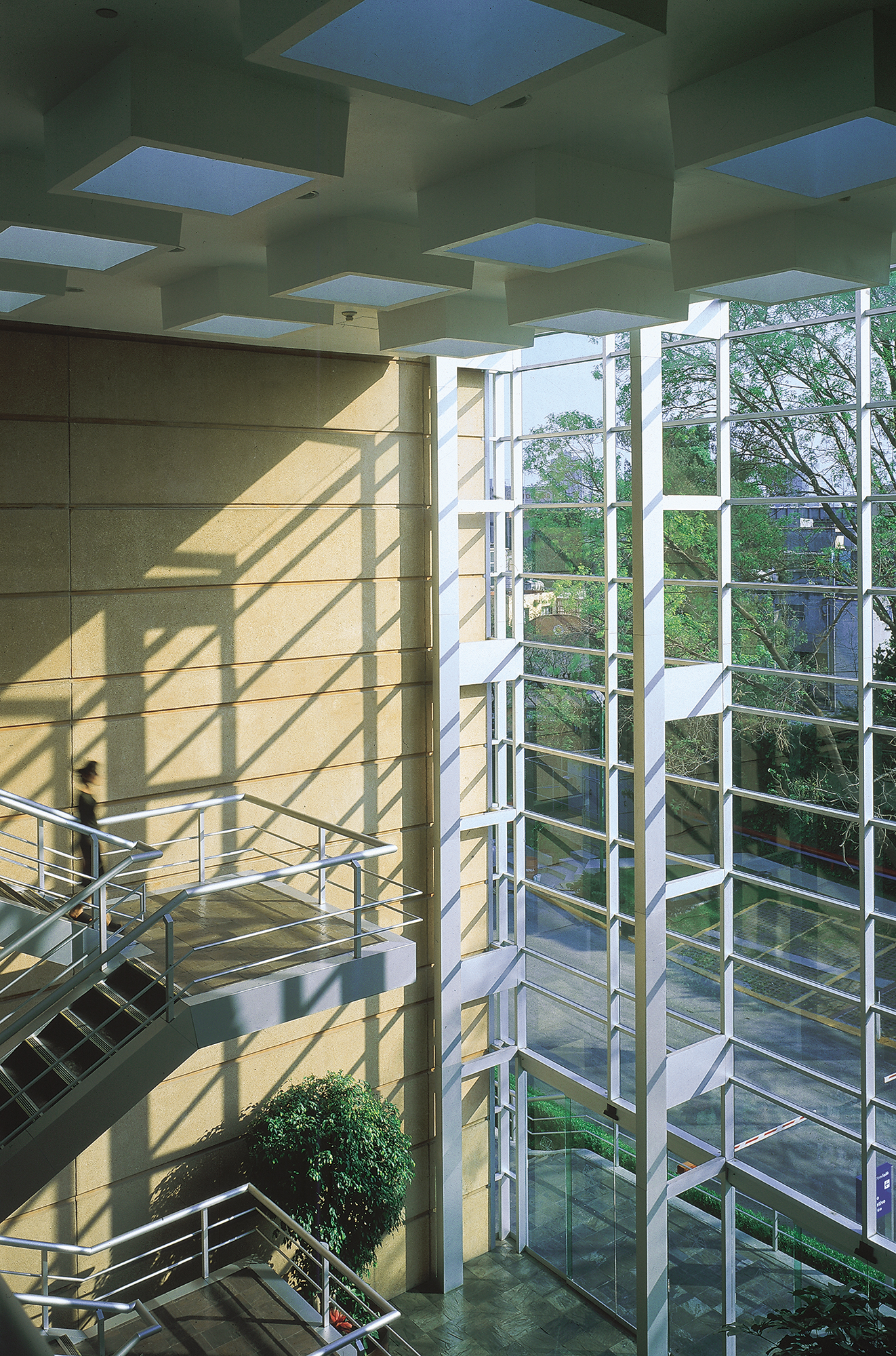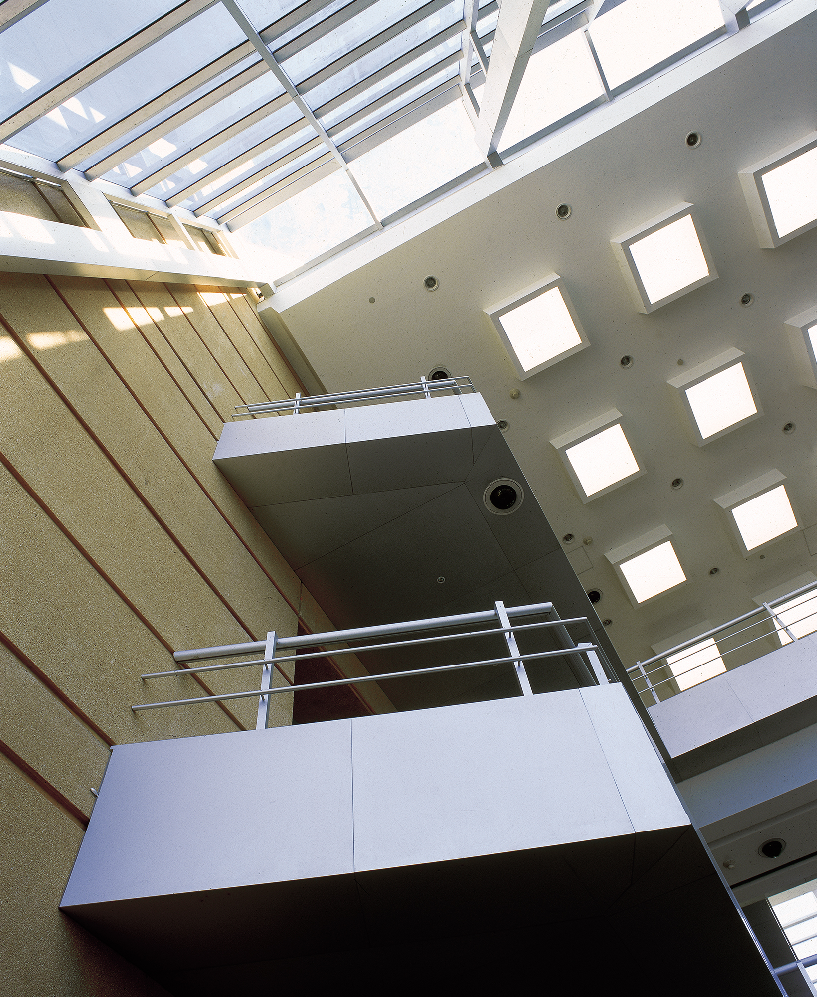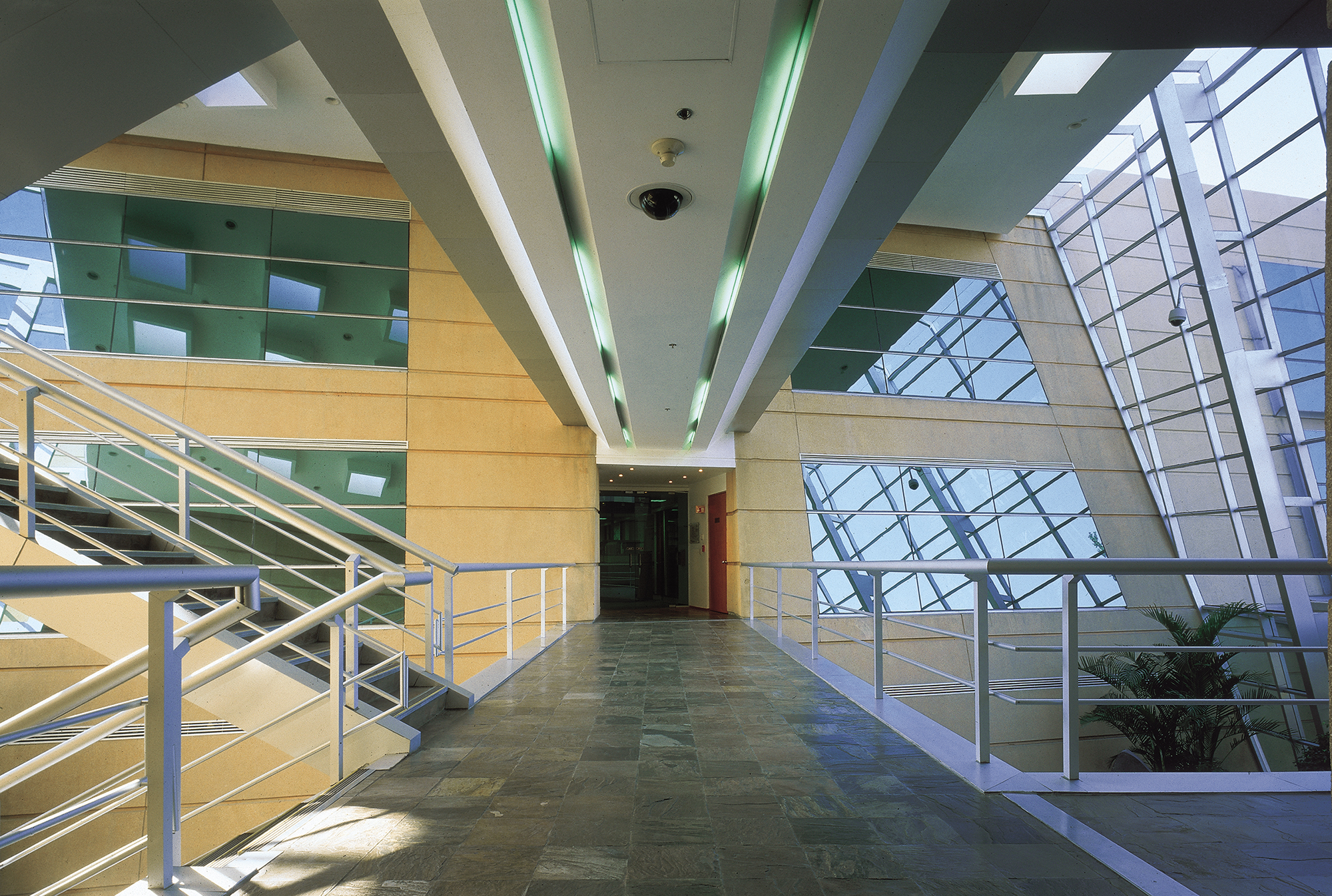 Con accesos norte y sur, el atrio funciona como filtro permeable que orienta los flujos y genera transparencia mediante amplias bandas de cristal. Los volúmenes inclinados contrastan luz y materialidad: muros sólidos frente a pieles de vidrio, prefabricados naranjas sobre verdes reflejos y texturas que integran el edificio a su entorno.