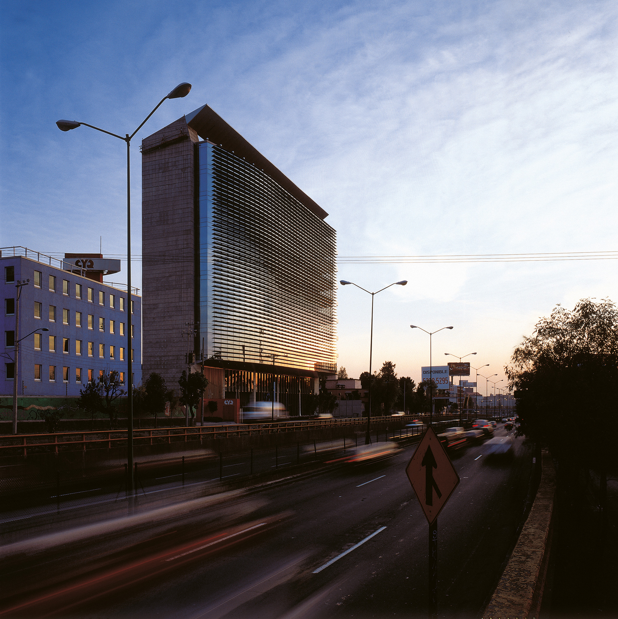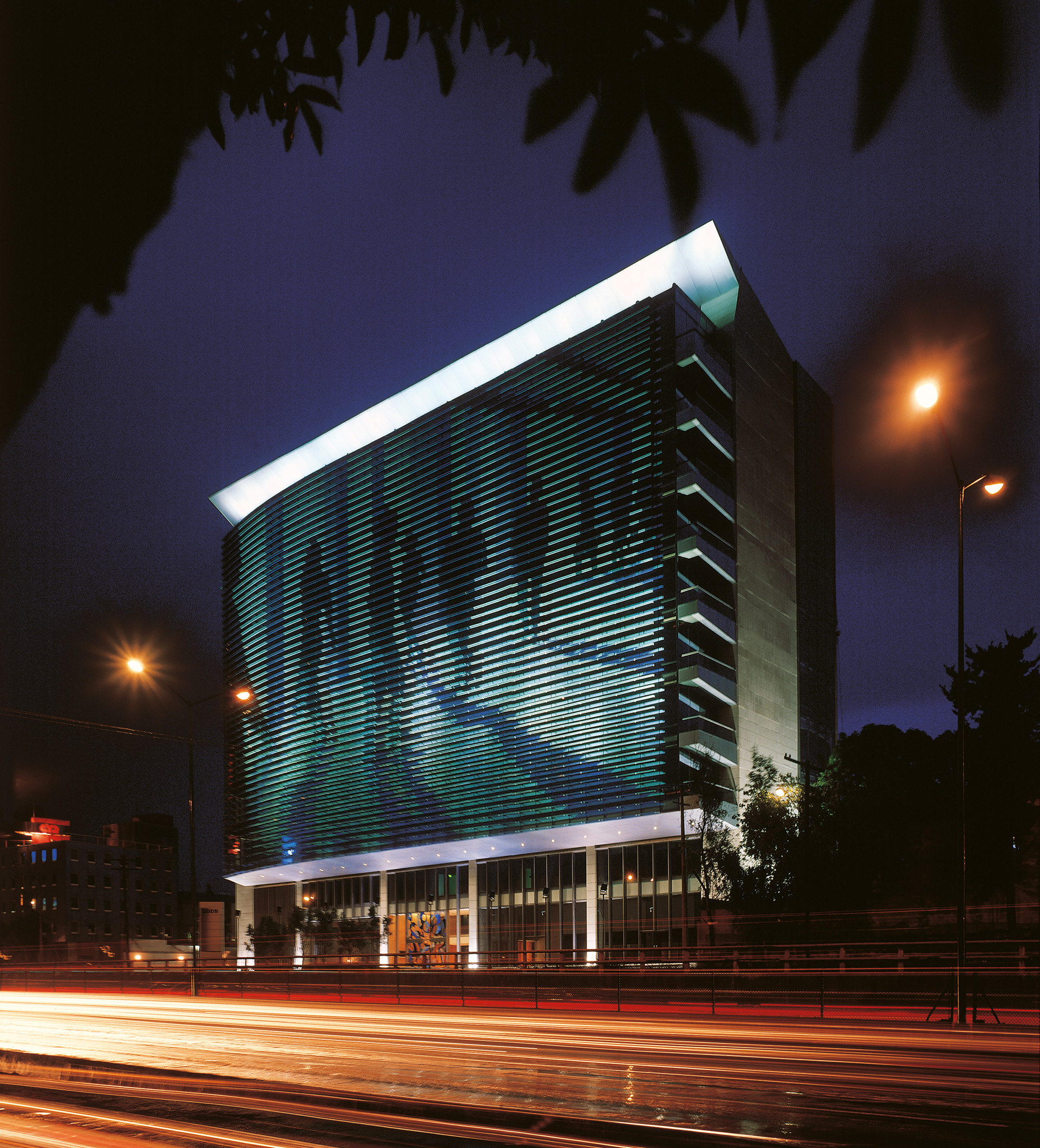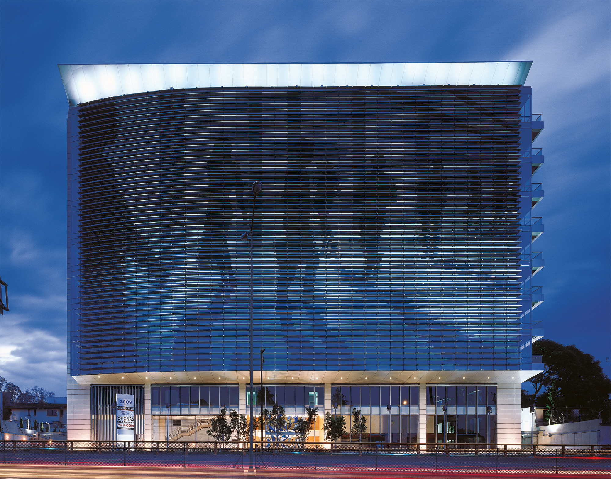Es un edificio escaparate con un núcleo de servicios al centro que incluye 4 sótanos de estacionamiento, planta baja, mezzanine, 9 niveles de oficinas y un roof garden. Los pisos corporativos aprovechan al máximo la iluminación natural. Cuenta con un basamento que se encuentra remetido cinco metros en los primeros diez metros de altura, lo que da la sensación de que el resto del edificio flota en el espacio. El volumen se corona mediante una cubierta ligera por medio de la cual se ligan dos muros de concreto laterales que rigidizan el edificio y lo limitan en las colindancias. Las vistas desde el interior se prolongan hacia las zonas residenciales vecinas, gracias a que la construcción se desplanta varios metros arriba de los carriles centrales de la vialidad.