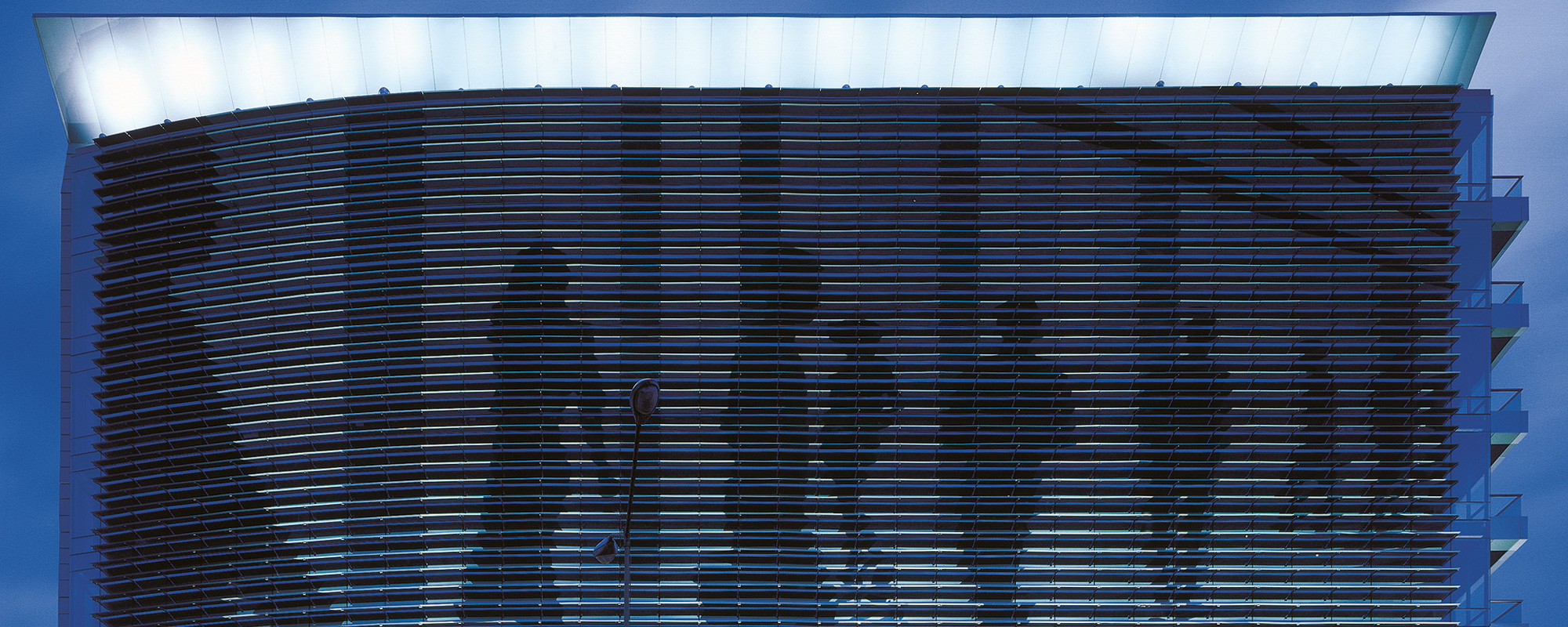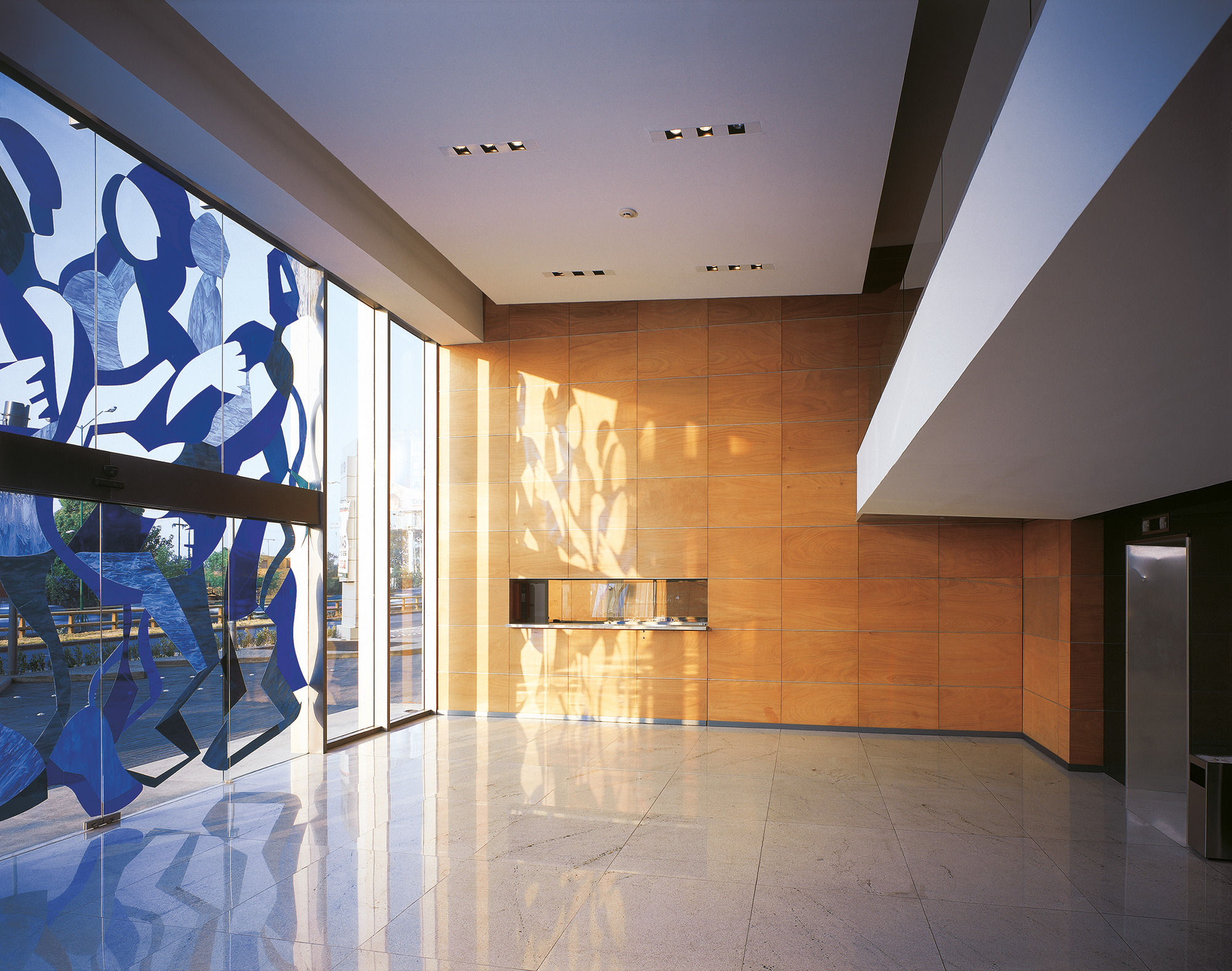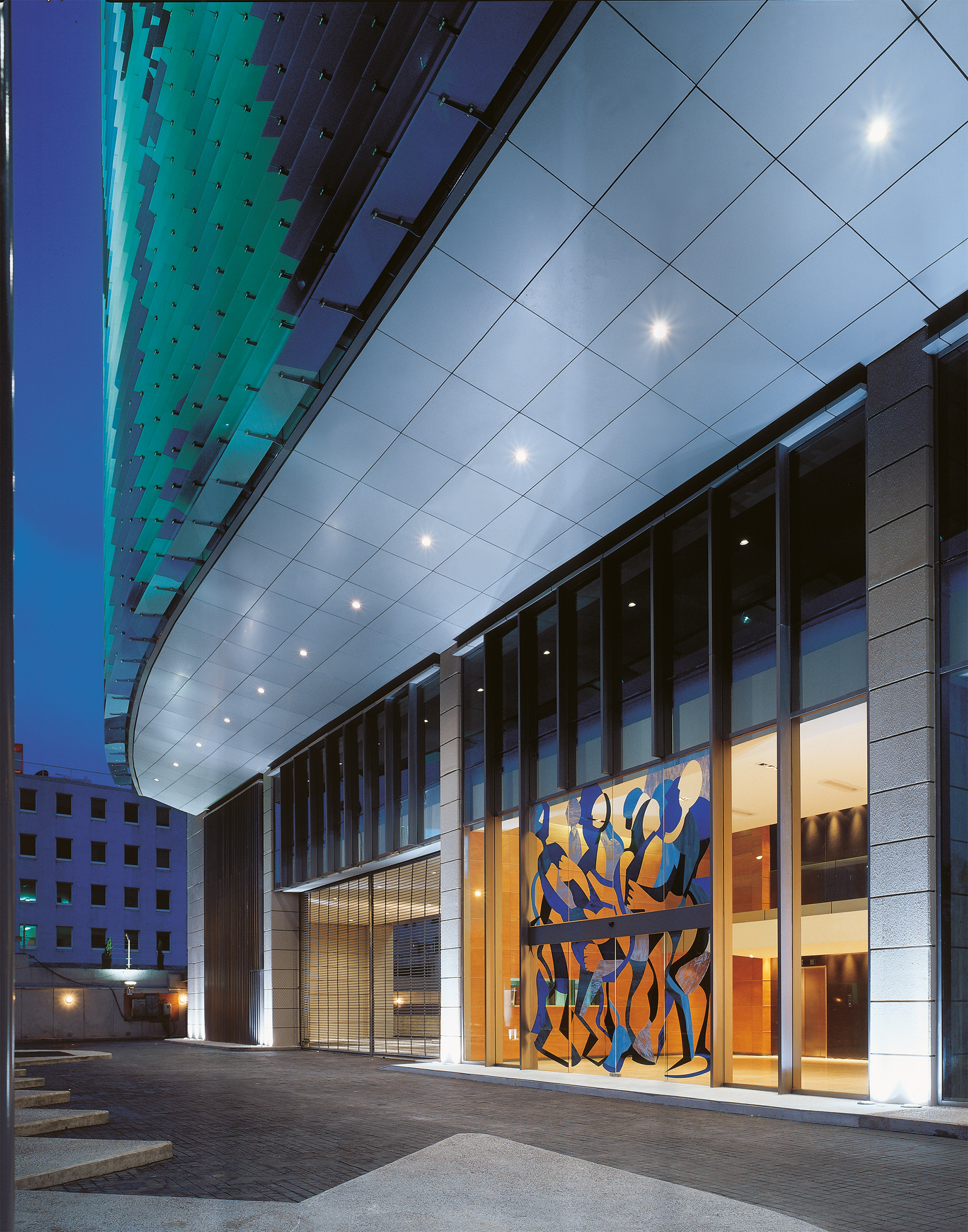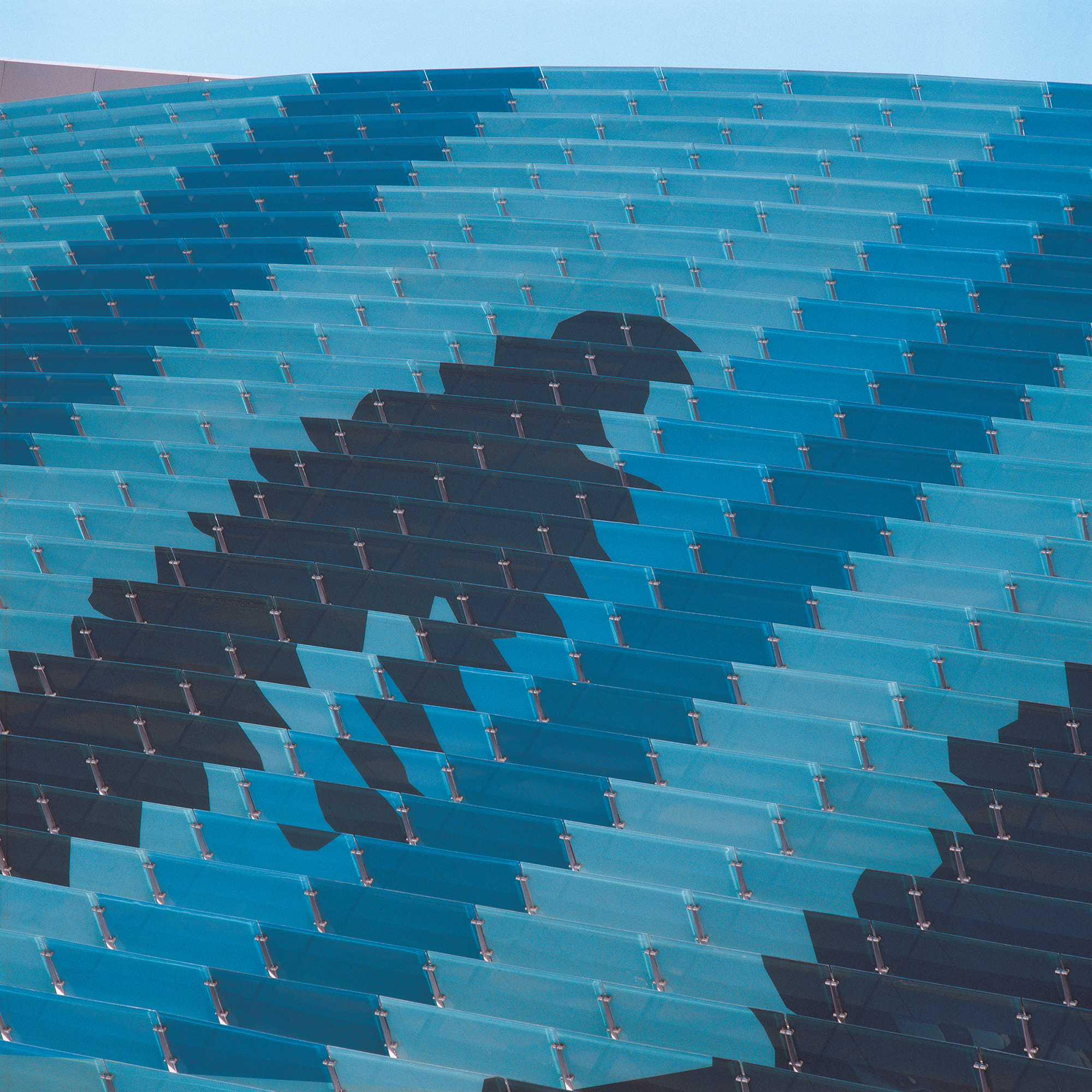 Incorporamos una gran imagen en tonalidades azules de personas en movimiento para destacar el concepto de mural urbano, proporcionando así un efecto adicional al dinamismo que contiene la imagen por sí sola. Ésta se arma con los parteluces de cristal templado perpendiculares al paramento de cristal vertical. Asimismo, los parteluces y cristales son especiales para el control de la incidencia solar. El mural urbano es un atractivo especial del edificio y, al ser único en su tipo, se suma al contexto creando una imagen que mejora el entorno de la ciudad.