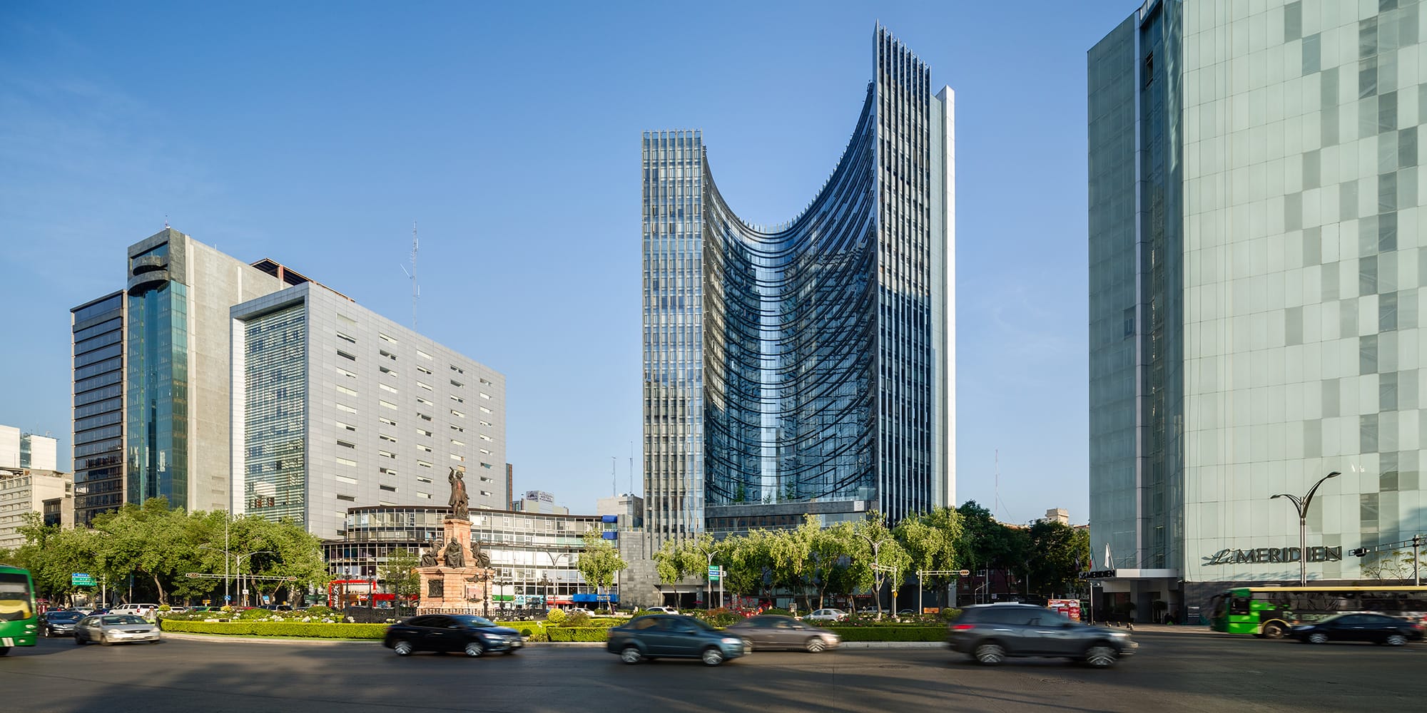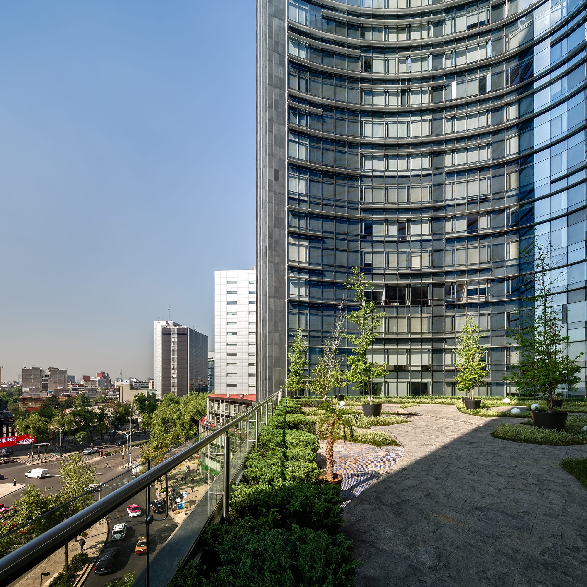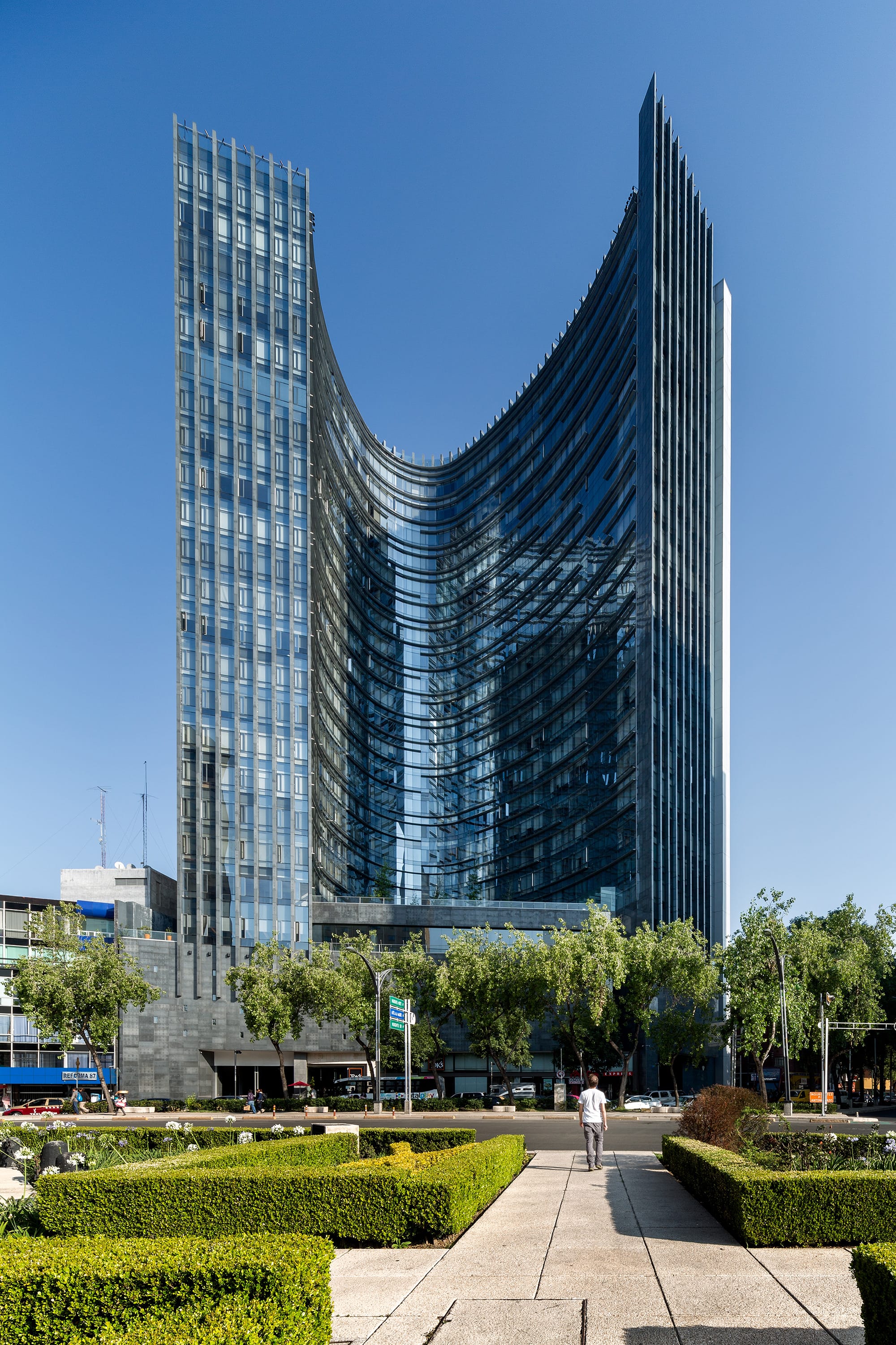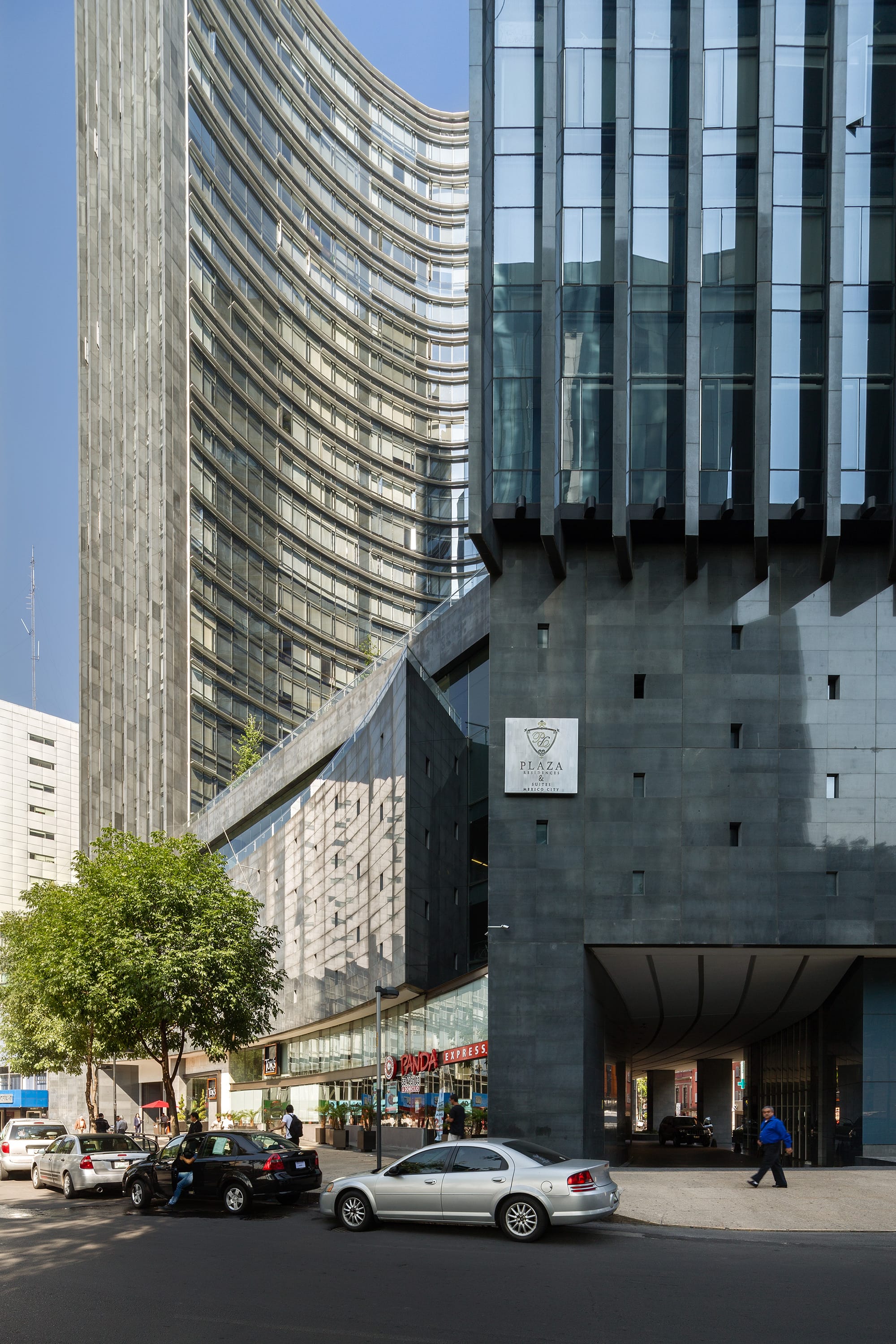 Plaza Residences es un edificio icónico que aporta carácter escultórico al paisaje de Paseo de la Reforma. Su forma de boomerang, con fachada cóncava de cristal, enmarca la glorieta de Colón y garantiza vistas privilegiadas desde todos los departamentos. Se eleva sobre un basamento pétreo que otorga solidez a los niveles inferiores, donde se ubican áreas comunes, comercio y servicios. La volumetría superior se presenta como una cortina de cristal con parteluces de aluminio dispuestos aleatoriamente, generando un juego dinámico de luz y sombra. La fachada convexa incorpora bandas horizontales que albergan circulaciones y se convierten en miradores. Las esquinas verticales rematan en una caja de luz nocturna con columnatas y cristal, que define la silueta del edificio. Un mural tipo “pisal” en la plaza refuerza la conexión con el espacio urbano y funciona como transición visual. Plaza Residences se consolida como un nuevo referente arquitectónico sobre una de las avenidas más emblemáticas de la Ciudad de México.