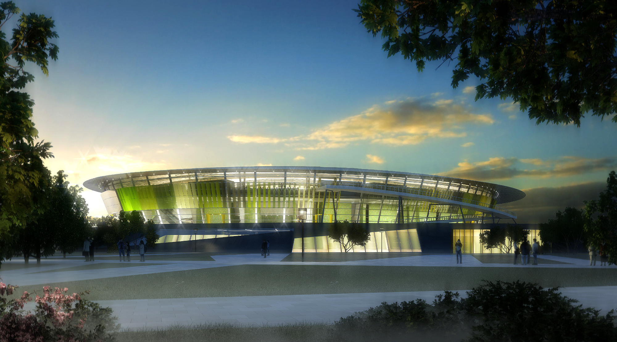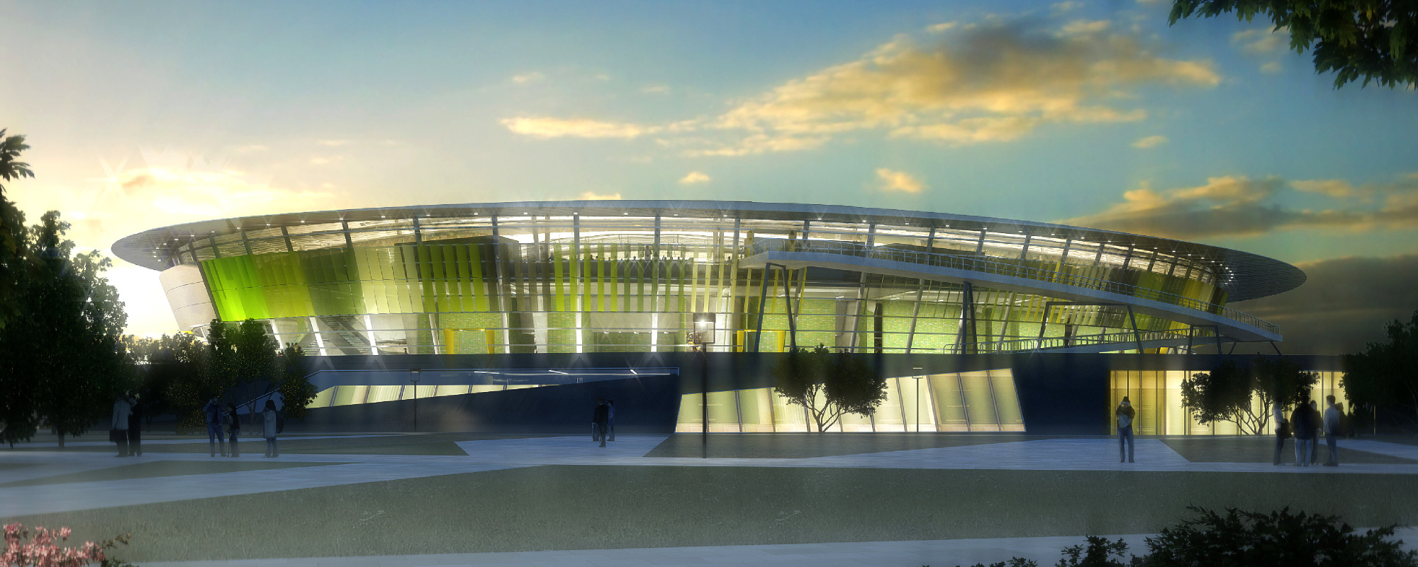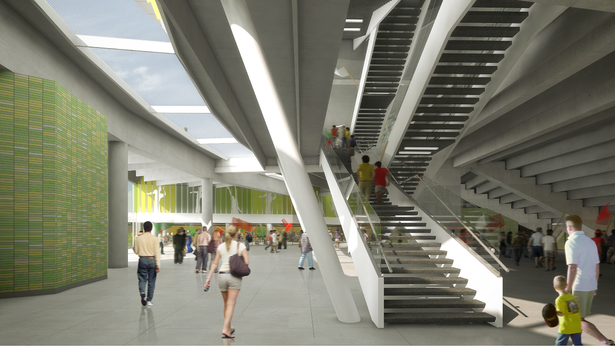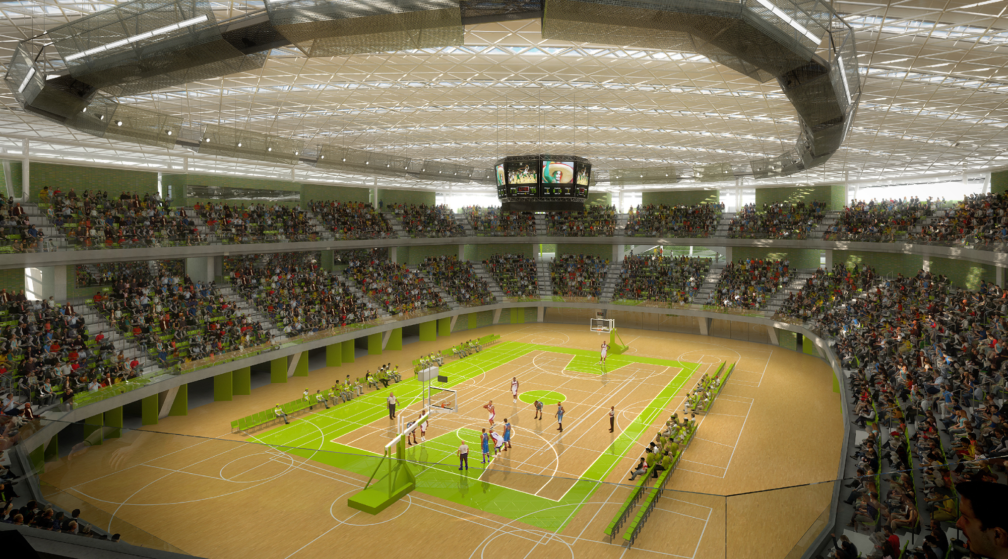 Este basamento sirve como gran foyer al aire libre y facilita el acceso a distintos niveles mediante rampas escultóricas que también funcionan como miradores. En su interior se distribuyen áreas deportivas, gimnasio, danza, ludoteca y cafeterías. Los niveles superiores albergan servicios, oficinas, palcos y zonas técnicas. El diseño exterior articula pavimentos y áreas verdes que garantizan accesibilidad y funcionalidad universal.