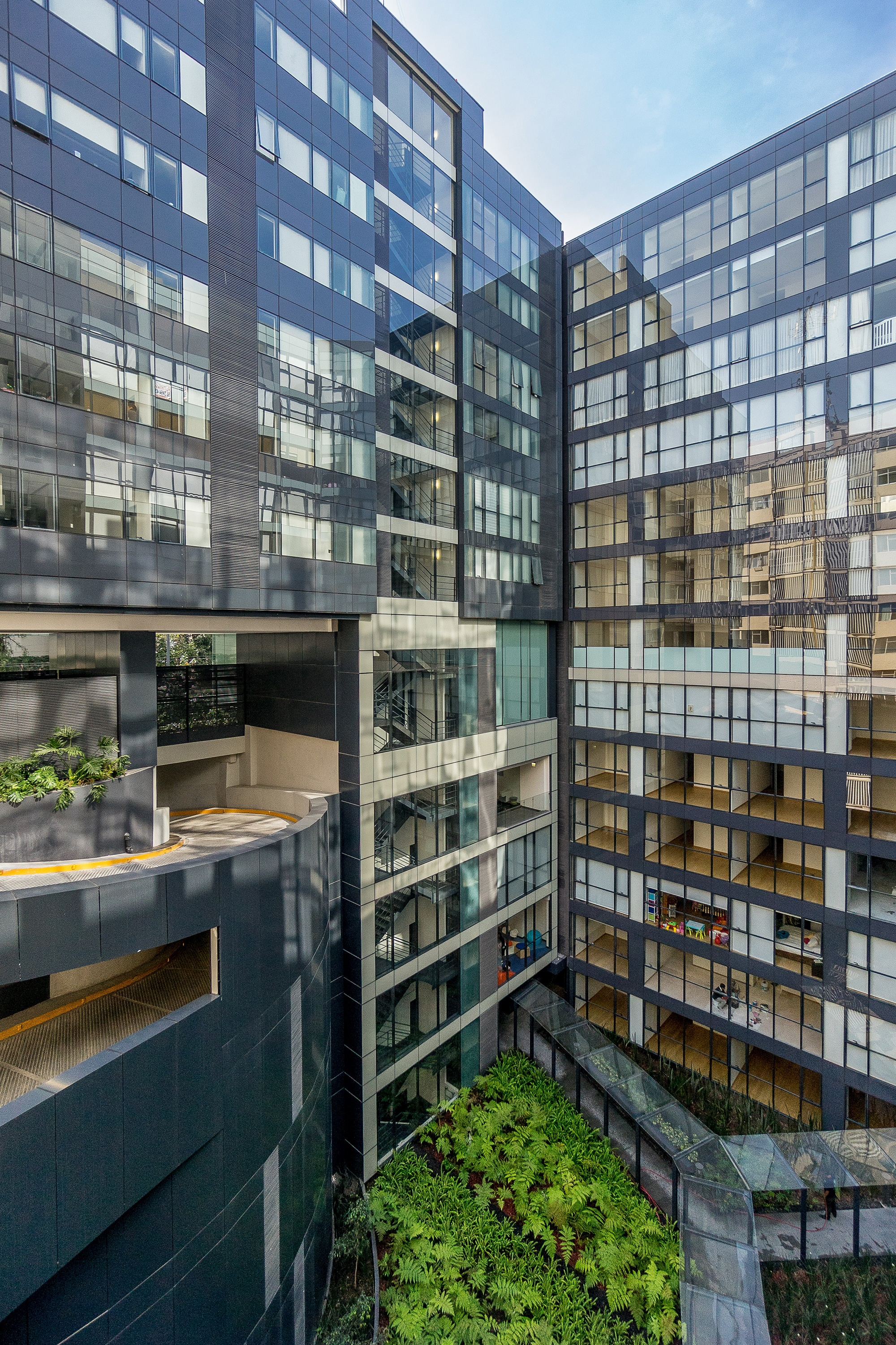 Uniq Lomas es un desarrollo residencial ubicado en Lomas de Chapultepec, una de las zonas con mayor plusvalía de la Ciudad de México. Se compone de dos torres con 86 departamentos de 180, 200 y 220 m², organizados en un volumen en herradura que abraza una plaza interior. Esta configuración optimiza la iluminación natural, la ventilación cruzada y las vistas hacia el entorno. El proyecto se adapta a un desnivel de 24 metros respecto a la calle, generando una amplia boca de acceso que articula las entradas peatonal y vehicular, y otorga ligereza al conjunto. Las fachadas, revestidas con vidrio y aluminio en tonos neutros, promueven la integración interior-exterior mediante superficies transparentes y extrusiones que aportan dinamismo. Uno de los principales atributos del proyecto es su contacto con una barranca natural, lo que permitió destinar más de 7,500 m² a áreas verdes que enriquecen las vistas, mejoran la calidad ambiental y ofrecen espacios de esparcimiento. Uniq Lomas se complementa con un programa completo de amenidades: gimnasio, alberca, spa, salón de adultos, ludoteca y salón de eventos, consolidándose como un desarrollo exclusivo que integra diseño contemporáneo, naturaleza y ubicación privilegiada.